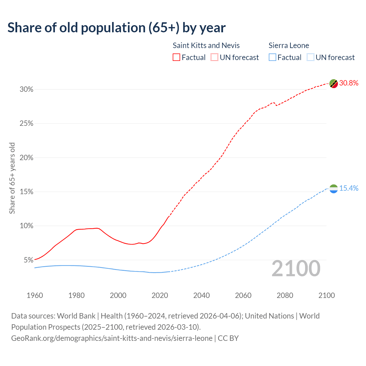 The share of older people aged 65 and over is 11.2% in Saint Kitts and Nevis and 3.24% in Sierra Leone. Life expectancy in Saint Kitts and Nevis compared to Sierra Leone .