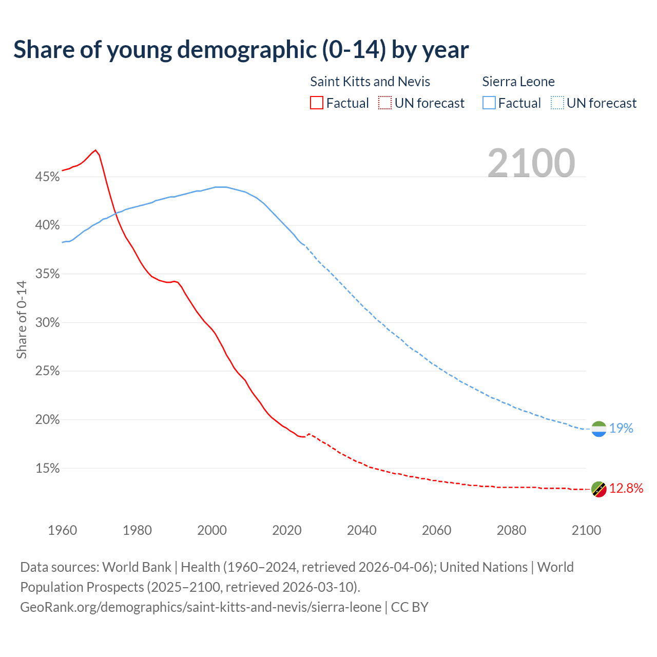 - The share of young demographic (0-15 years old) in Saint Kitts and Nevis is 18.2% vs 38.1% in Sierra Leone.