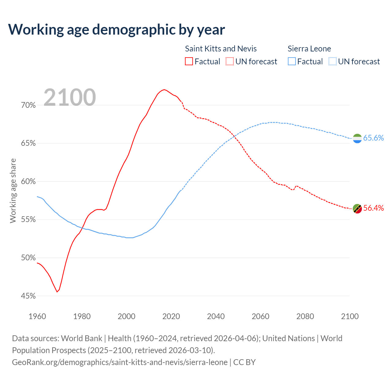 - Saint Kitts and Nevis has 33.2K working age adults (aged 15-64) vs 5.31M in Sierra Leone.