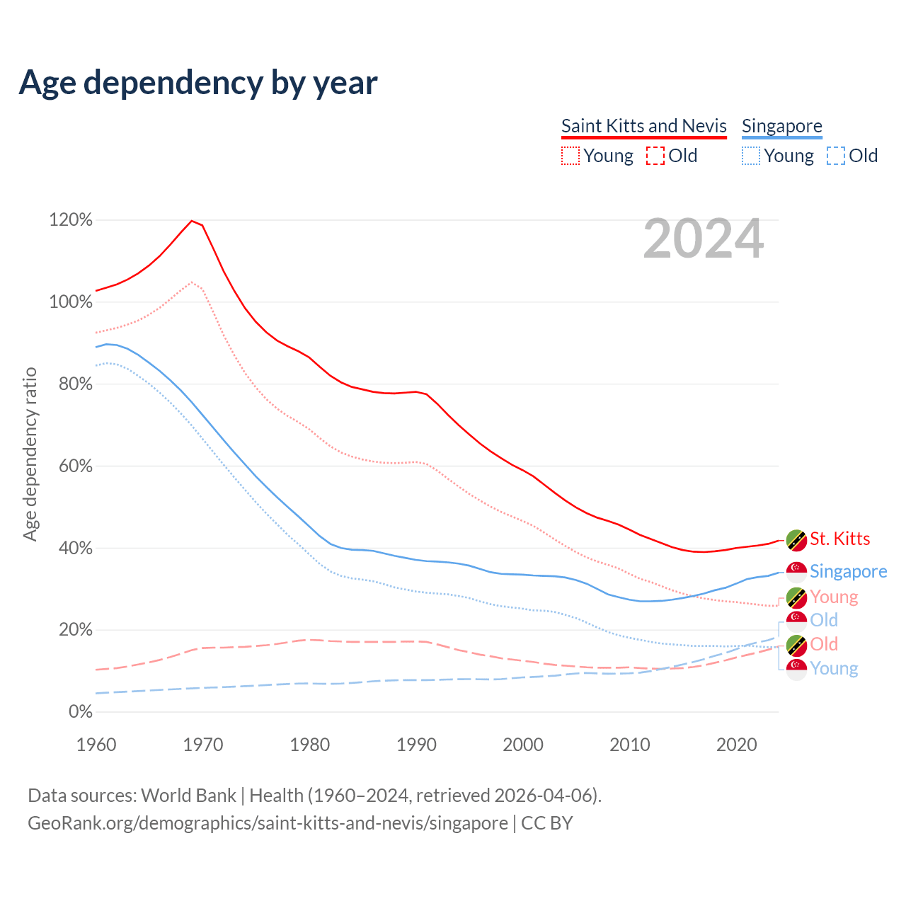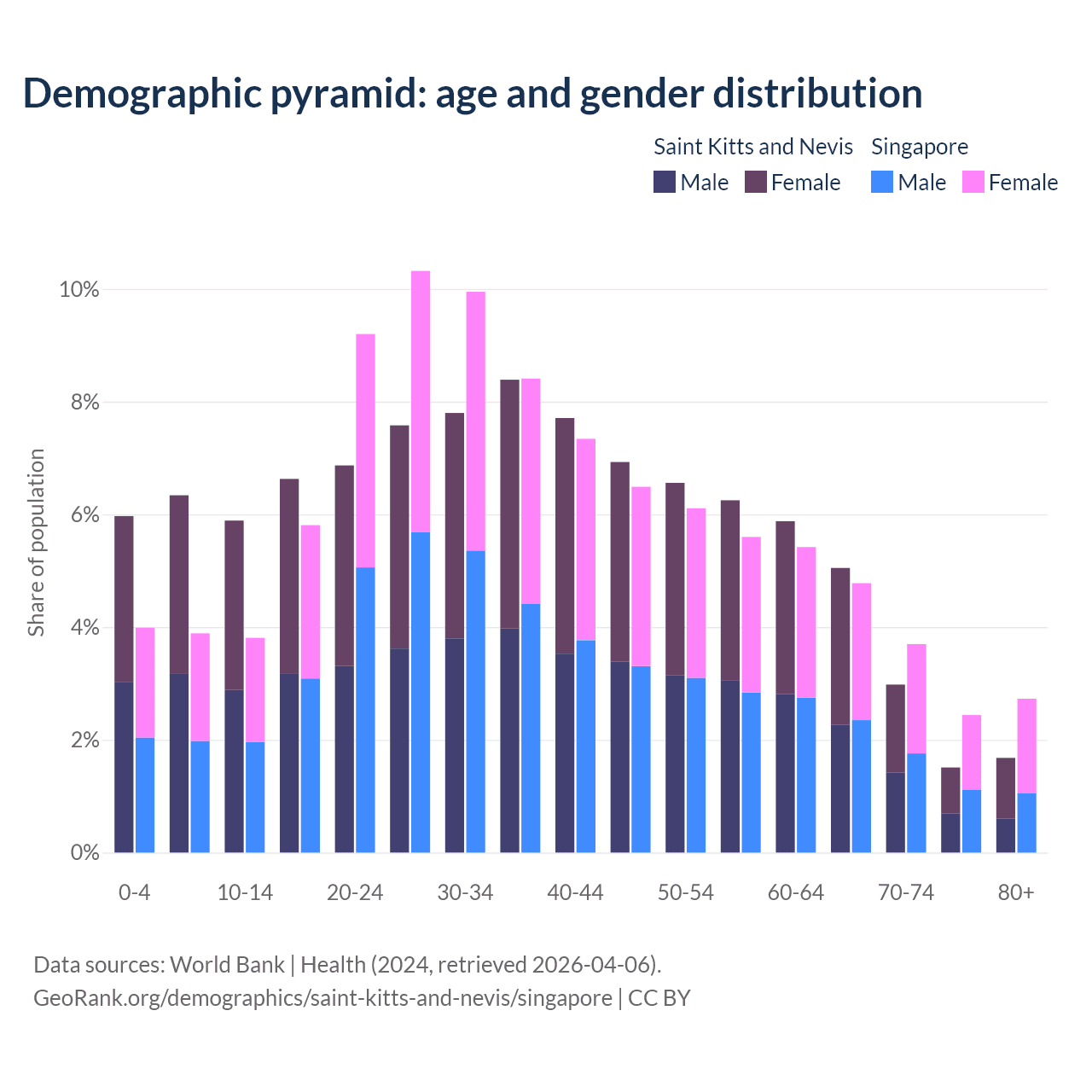 - Saint Kitts and Nevis is ranked 69/196 by median age (oldest to youngest) vs 68/196 for Singapore.