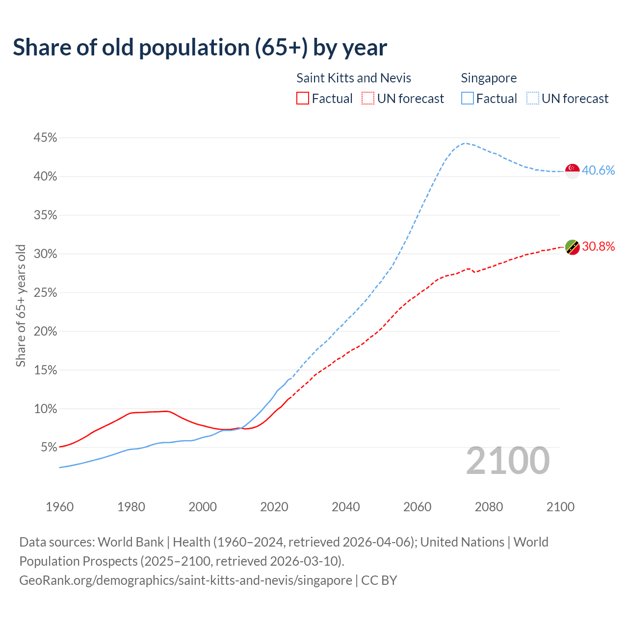 The share of older people aged 65 and over is 11.2% in Saint Kitts and Nevis and 13.7% in Singapore. Life expectancy in Saint Kitts and Nevis compared to Singapore .