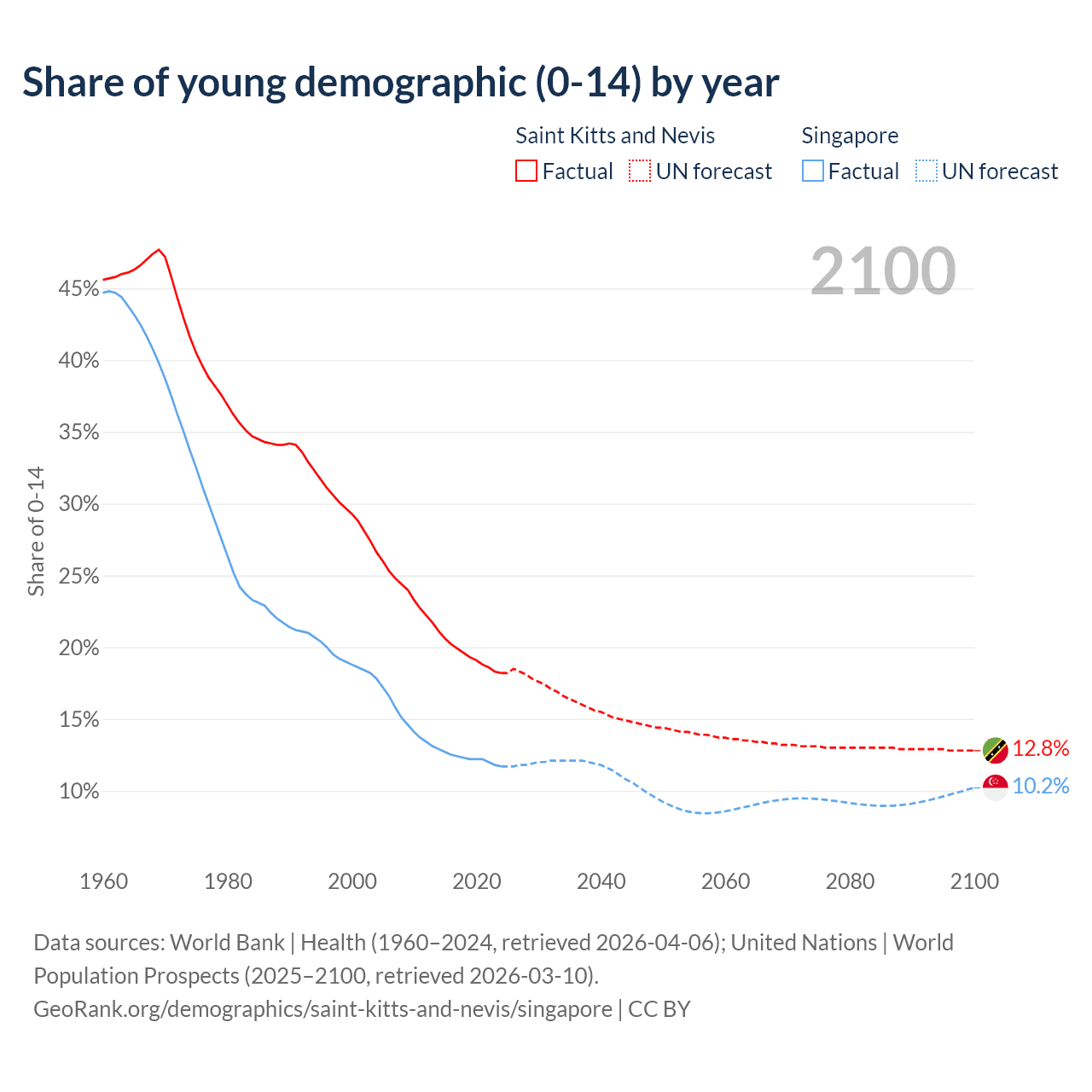 - The share of young demographic (0-15 years old) in Saint Kitts and Nevis is 18.2% vs 11.7% in Singapore.