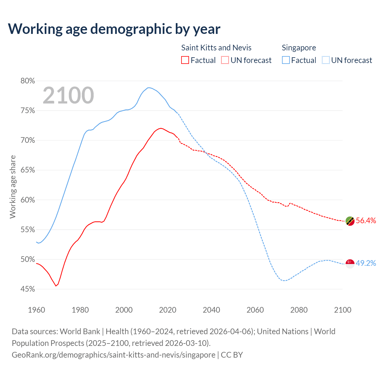 - Saint Kitts and Nevis has 33.2K working age adults (aged 15-64) vs 4.57M in Singapore.