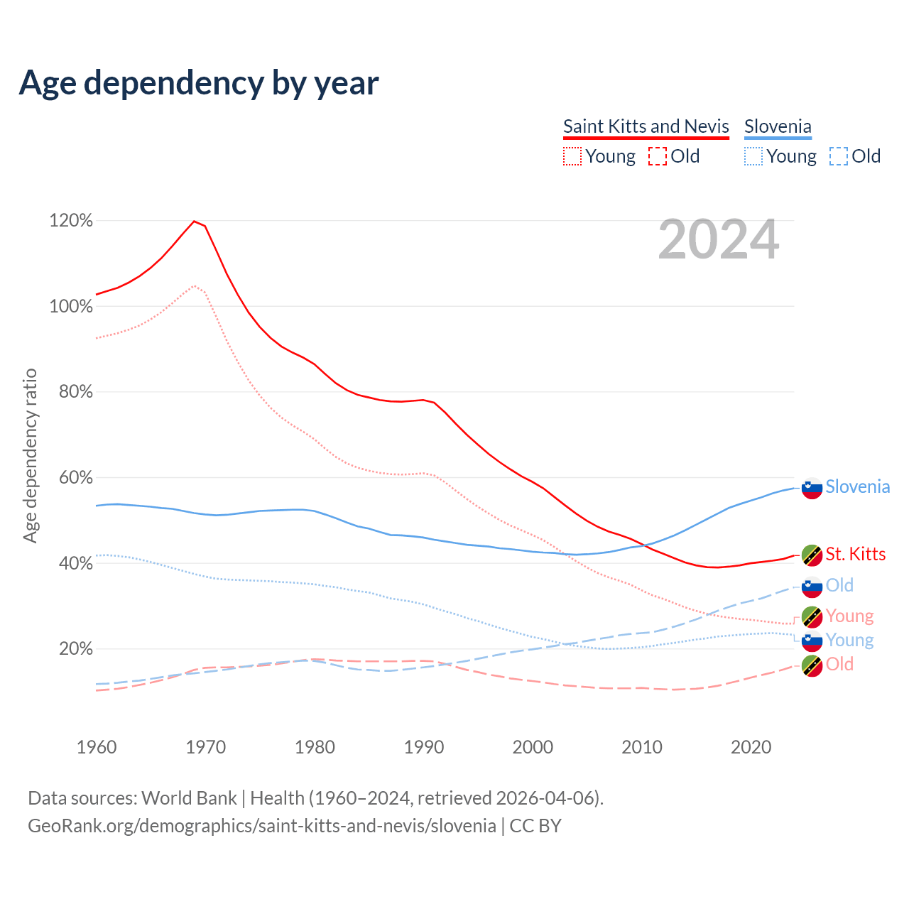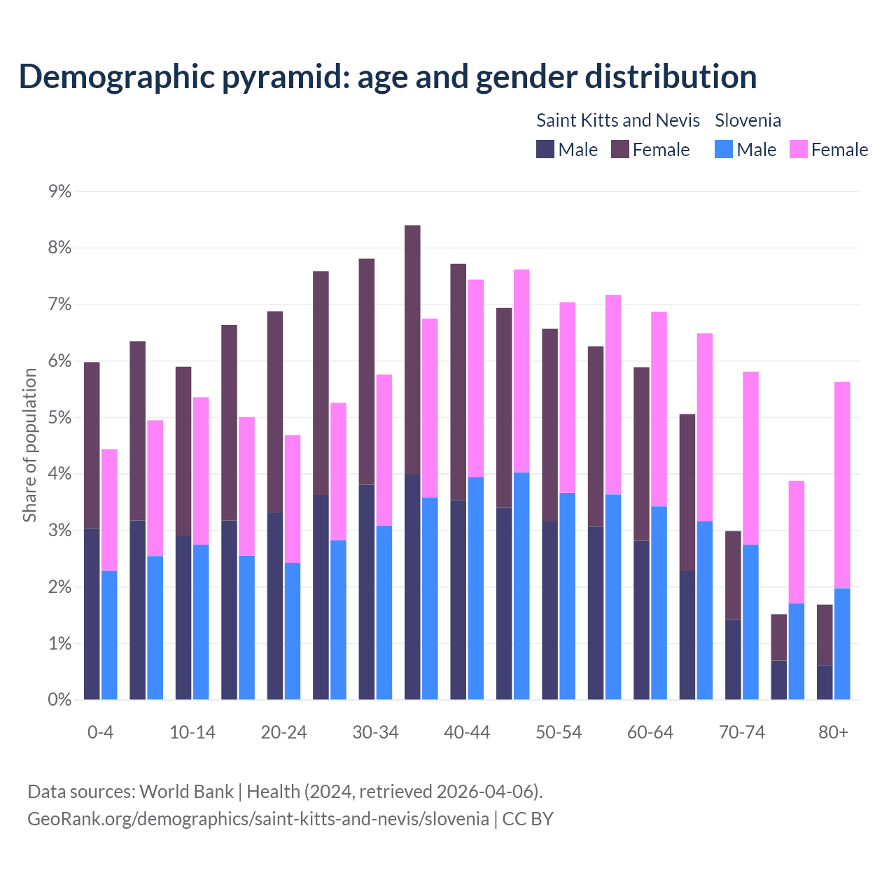 - The share of old-age demographic (65+) in Saint Kitts and Nevis is 11.2% vs 21.8% in Slovenia.