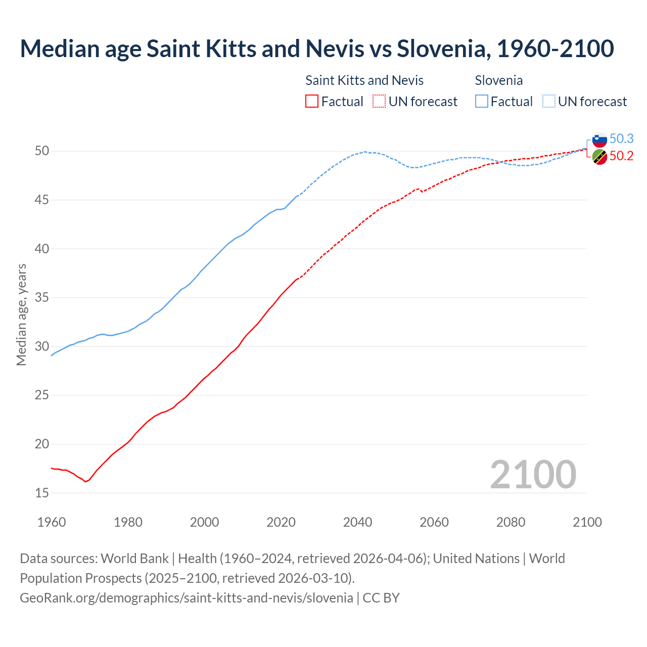 Median age Saint Kitts and Nevis vs Slovenia, 1960-2100