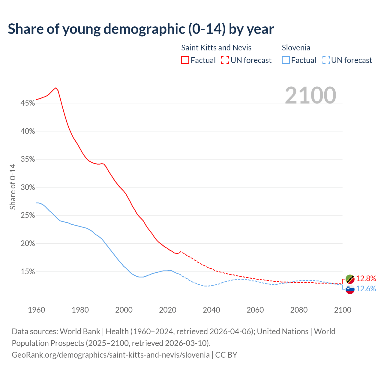 - The share of young demographic (0-15 years old) in Saint Kitts and Nevis is 18.2% vs 14.7% in Slovenia.