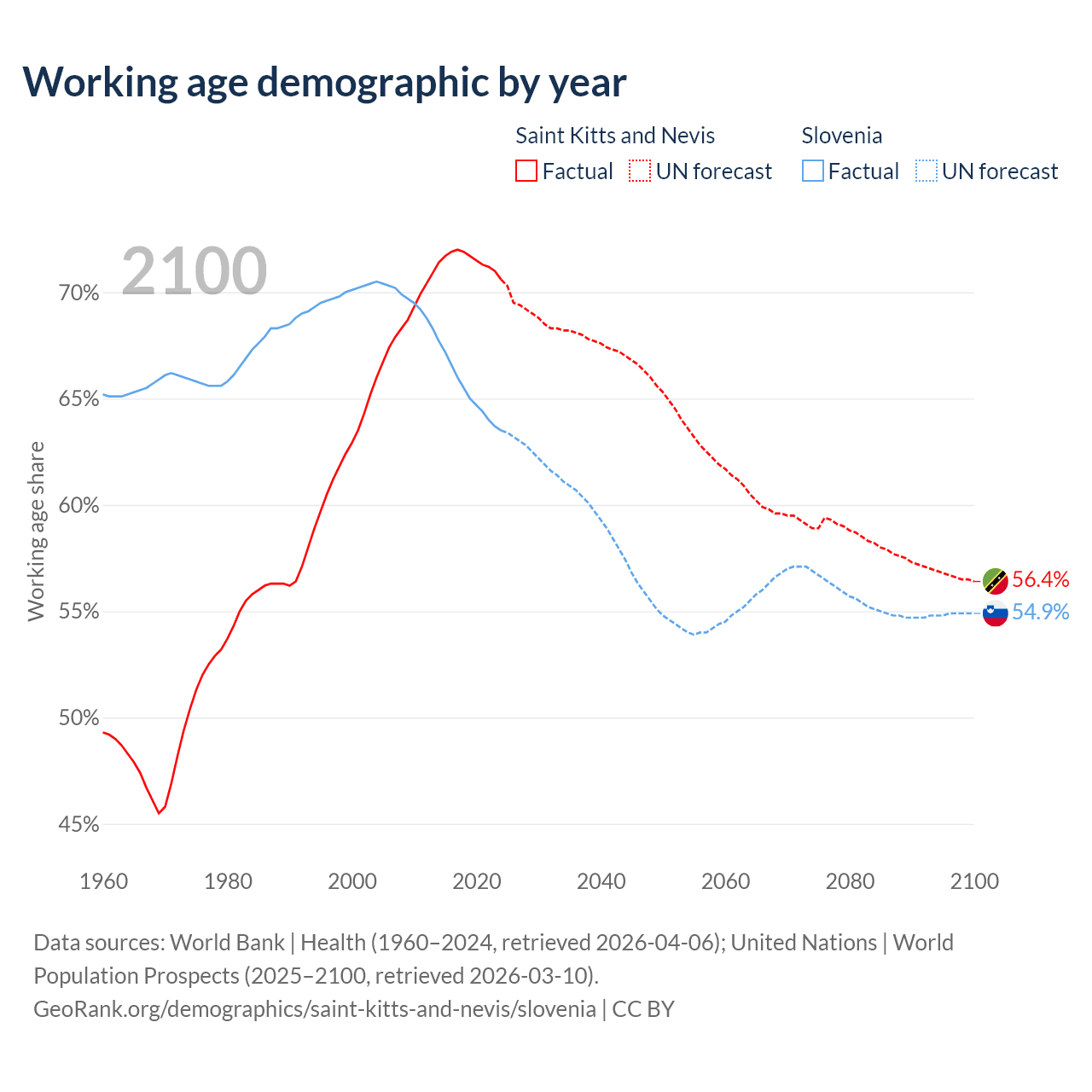 - Saint Kitts and Nevis has 33.2K working age adults (aged 15-64) vs 1.35M in Slovenia.