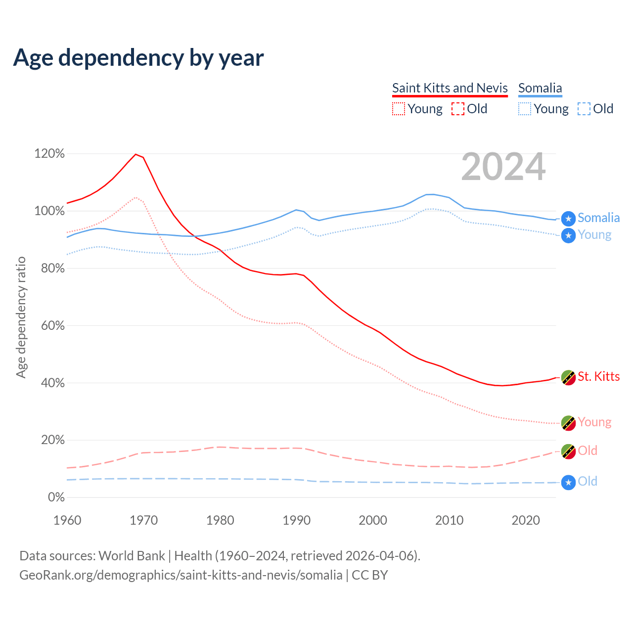 - Saint Kitts and Nevis is ranked 69/196 by median age (oldest to youngest) vs 194/196 for Somalia.