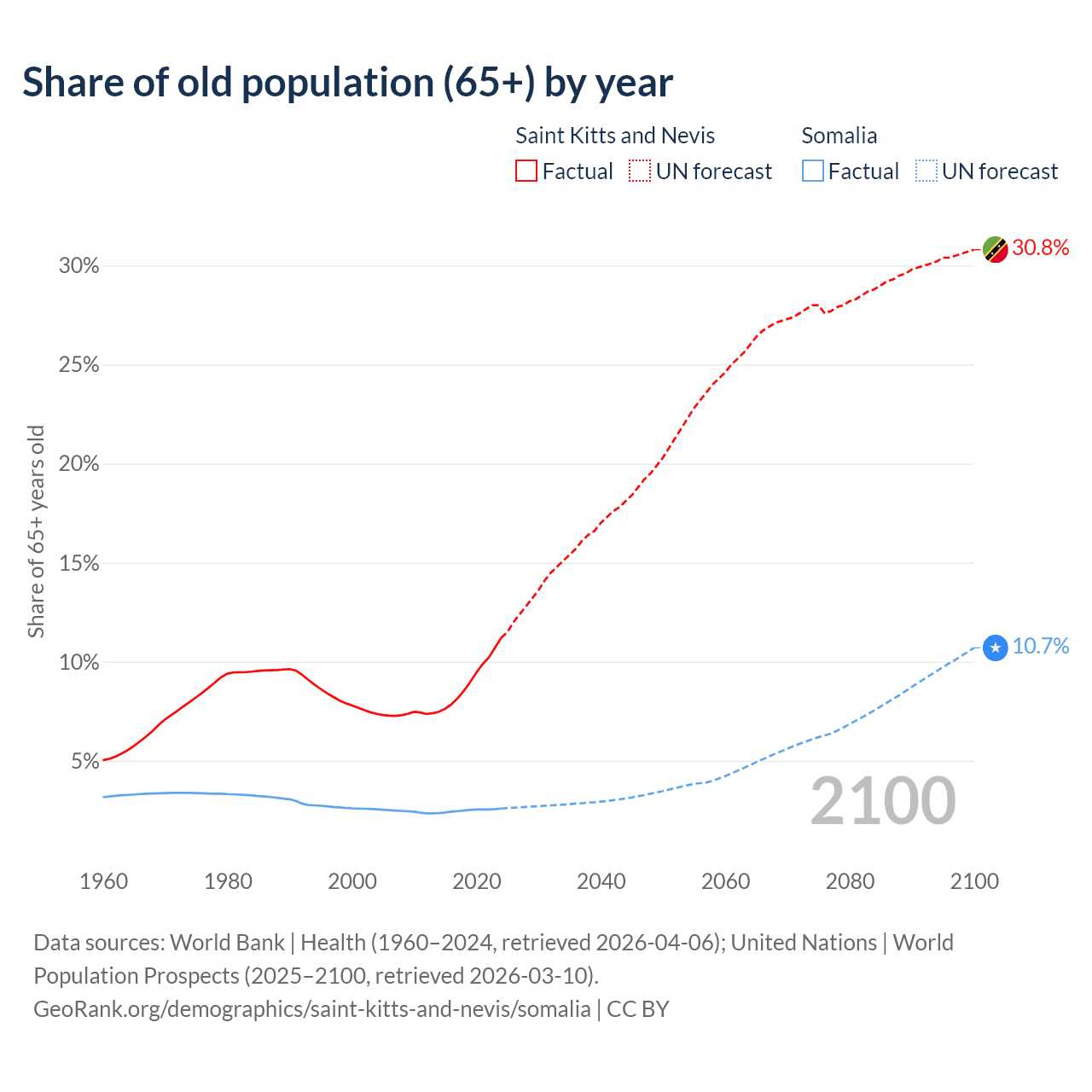 The share of older people aged 65 and over is 11.2% in Saint Kitts and Nevis and 2.59% in Somalia. Life expectancy in Saint Kitts and Nevis compared to Somalia .