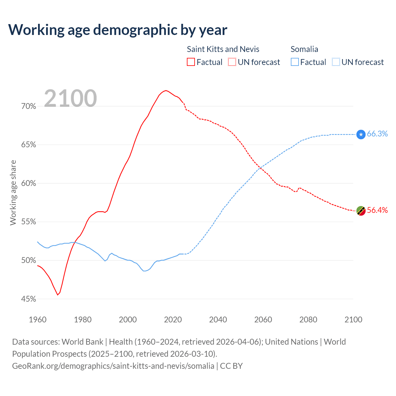 - Saint Kitts and Nevis has 33.2K working age adults (aged 15-64) vs 10.4M in Somalia.