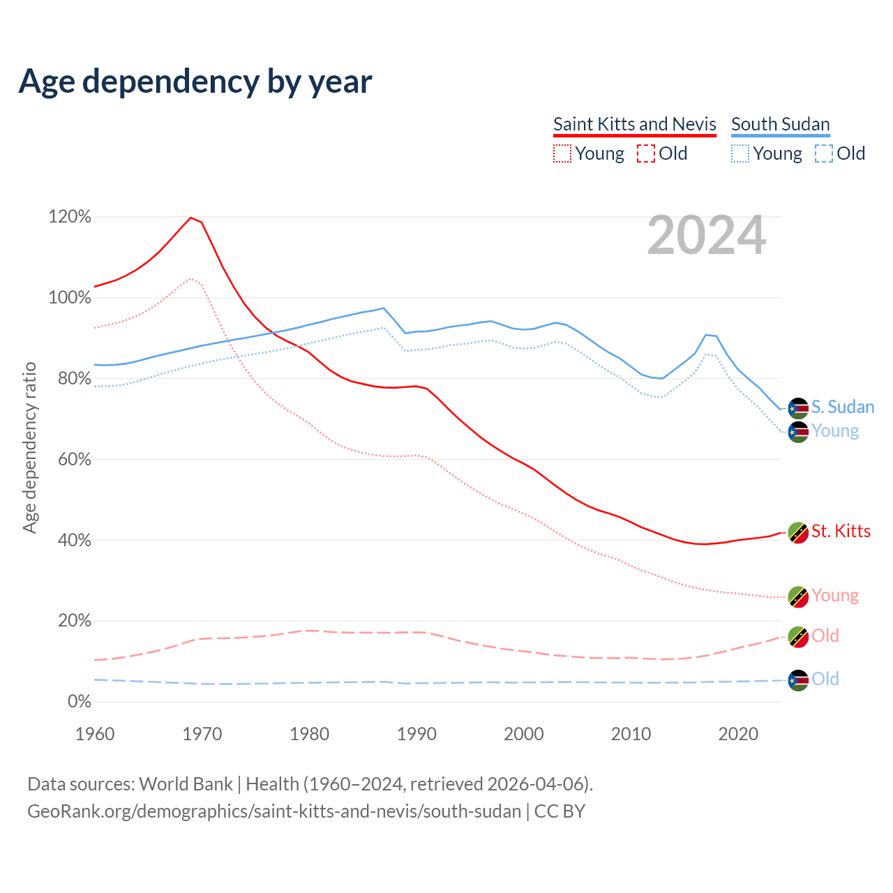 - Saint Kitts and Nevis is ranked 69/196 by median age (oldest to youngest) vs 173/196 for South Sudan.