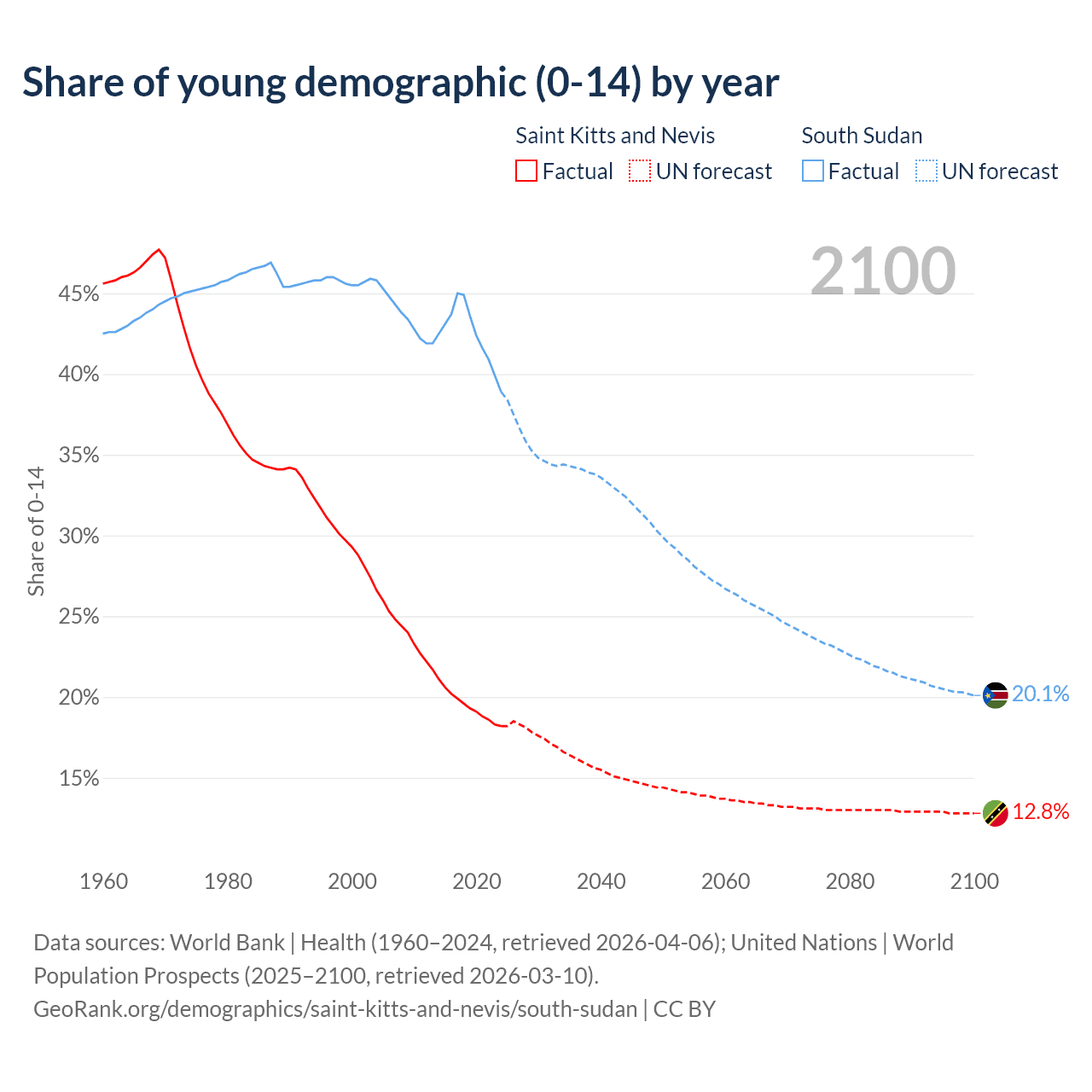 - The share of young demographic (0-15 years old) in Saint Kitts and Nevis is 18.2% vs 38.9% in South Sudan.