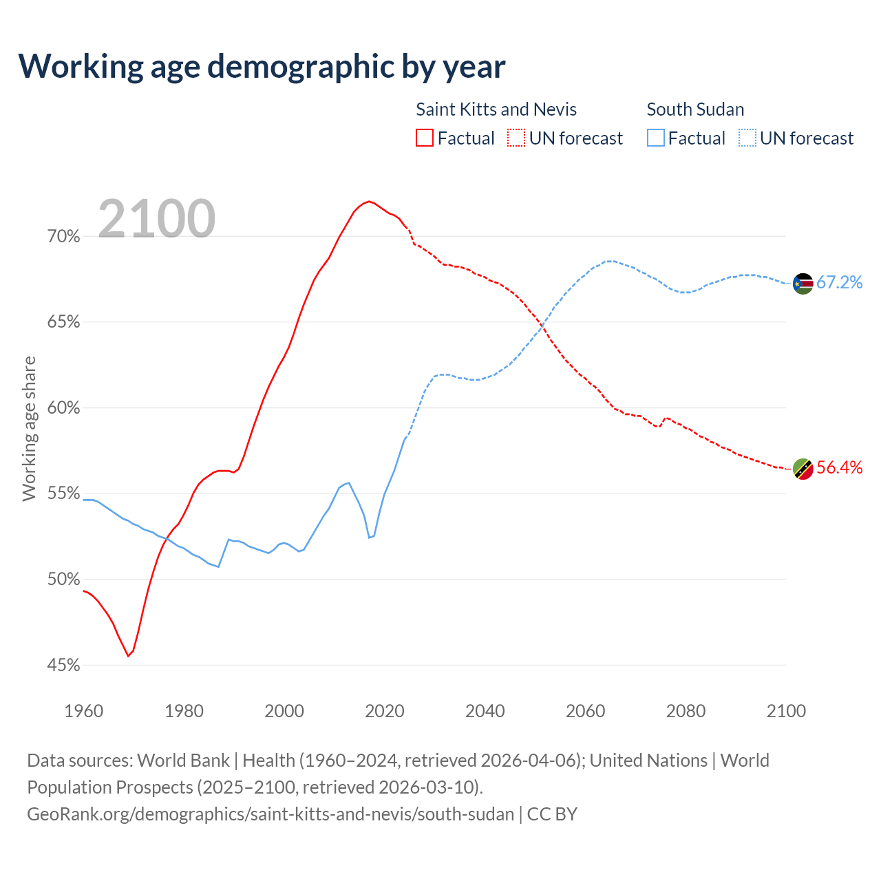 - Saint Kitts and Nevis has 33.2K working age adults (aged 15-64) vs 7.27M in South Sudan.