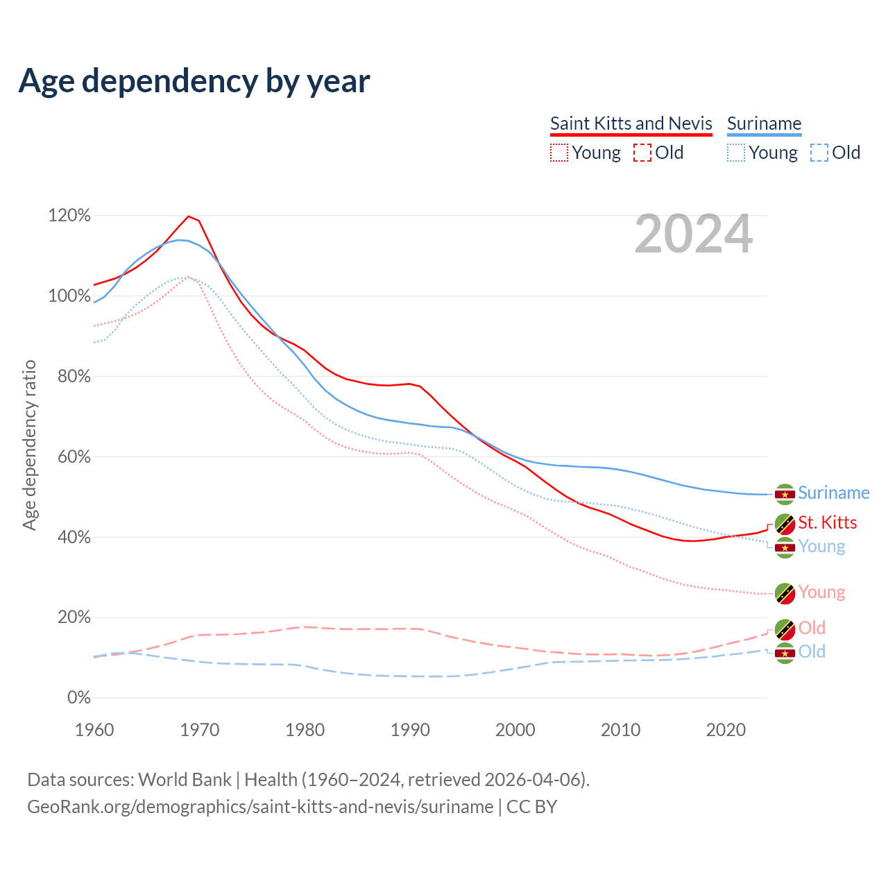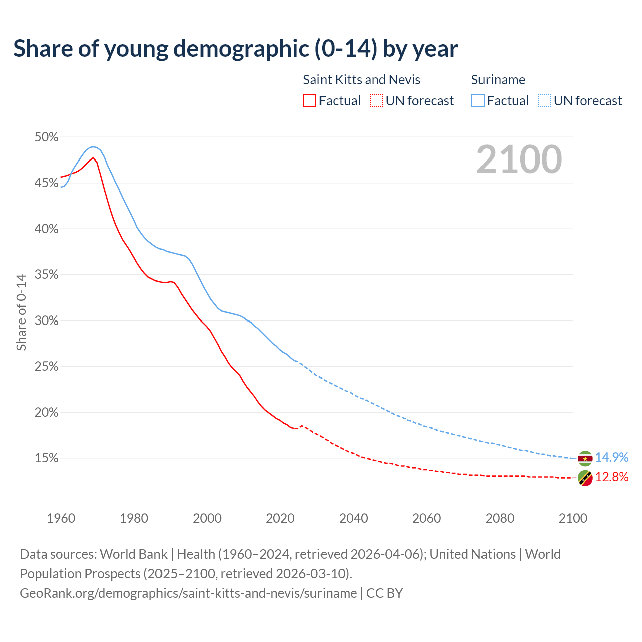 - The share of young demographic (0-15 years old) in Saint Kitts and Nevis is 18.2% vs 25.6% in Suriname.