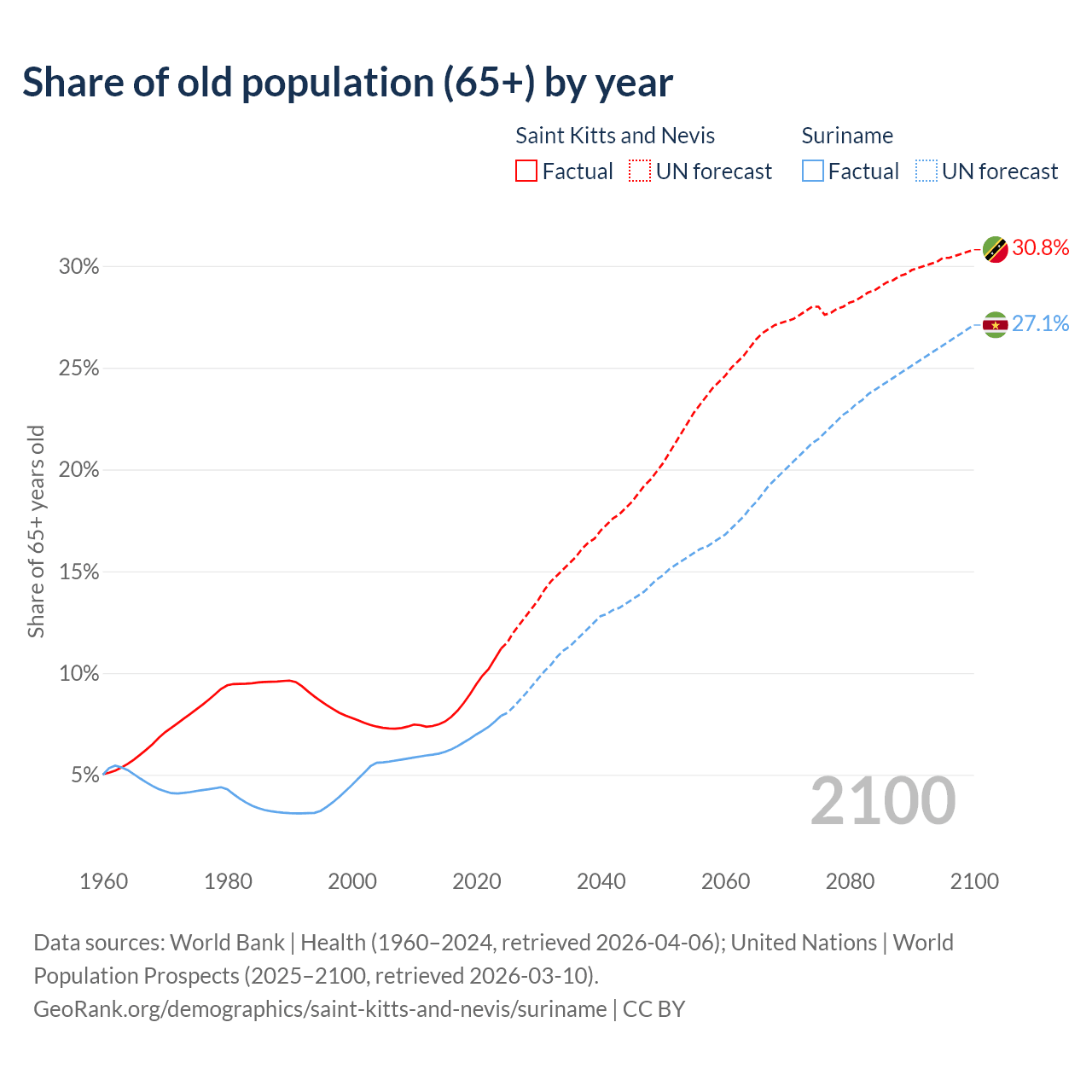 The share of older people aged 65 and over is 11.2% in Saint Kitts and Nevis and 7.9% in Suriname. Life expectancy in Saint Kitts and Nevis compared to Suriname .