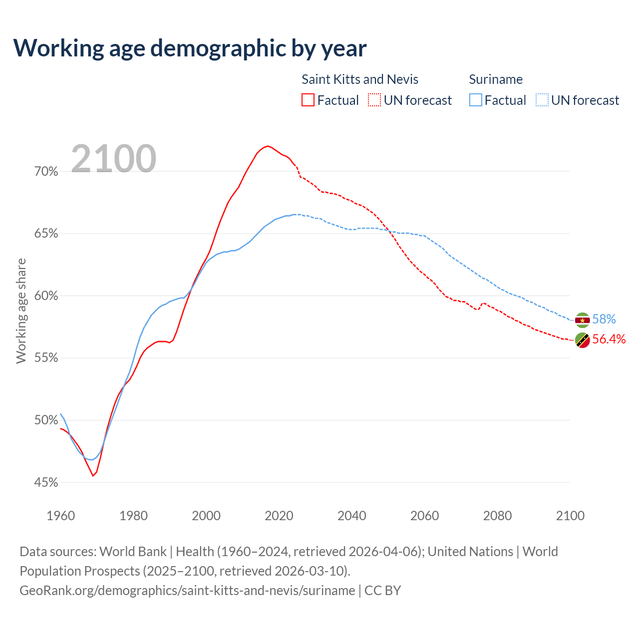 - Saint Kitts and Nevis has 33.2K working age adults (aged 15-64) vs 430K in Suriname.
