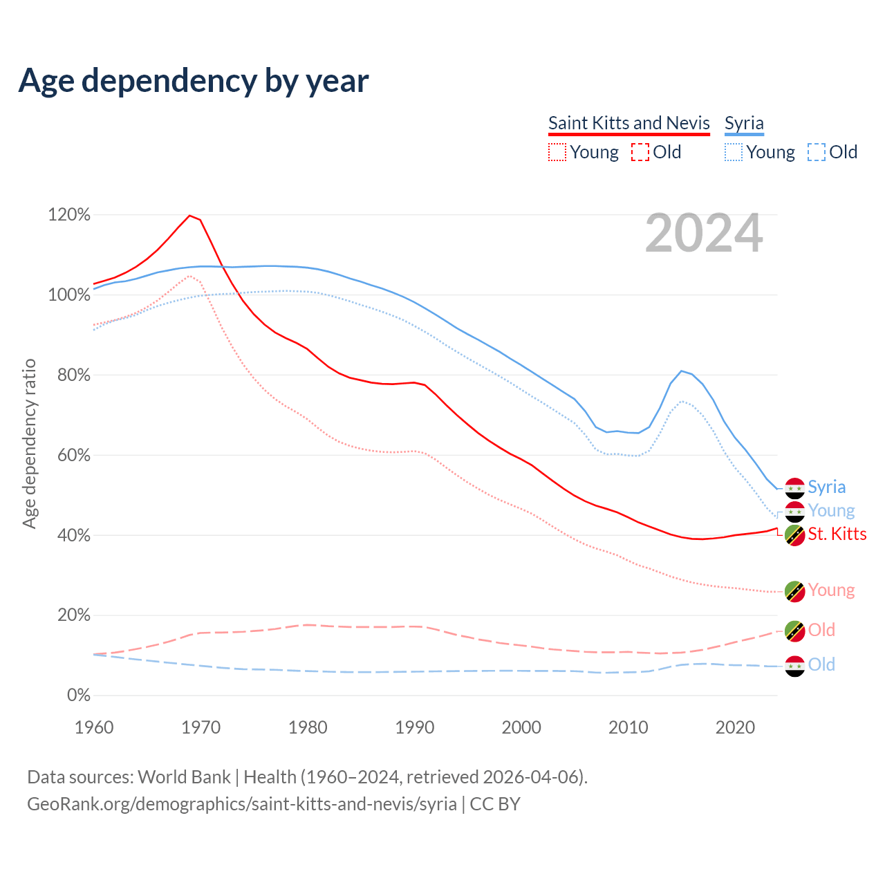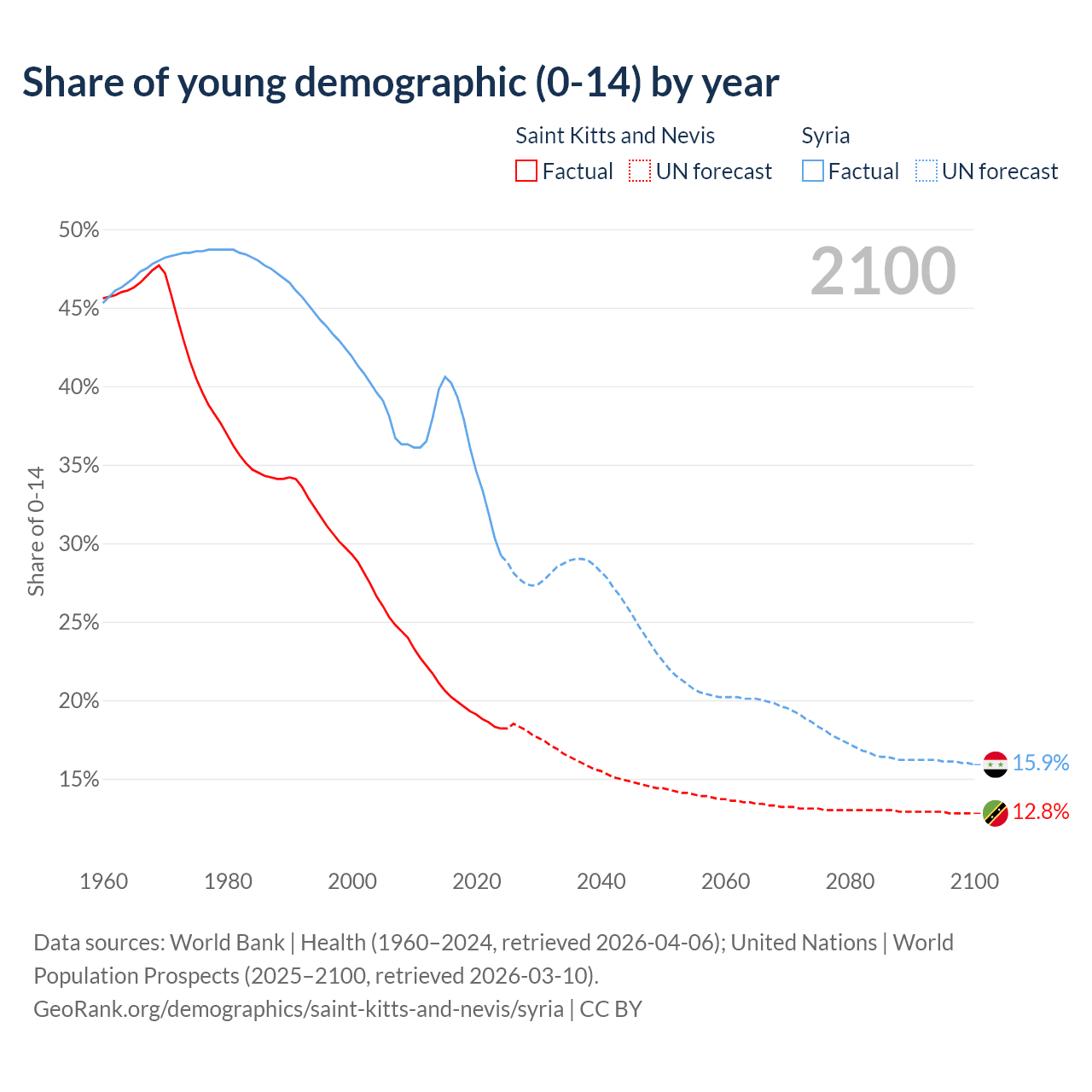 - The share of young demographic (0-15 years old) in Saint Kitts and Nevis is 18.2% vs 29.2% in Syria.