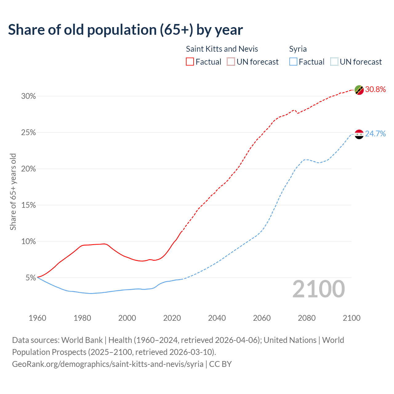 - The share of old-age demographic (65+) in Saint Kitts and Nevis is 11.2% vs 4.74% in Syria.