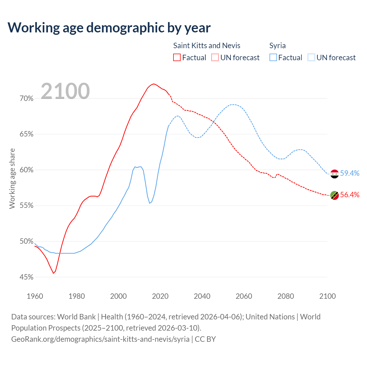 - Saint Kitts and Nevis has 33.2K working age adults (aged 15-64) vs 17.7M in Syria.