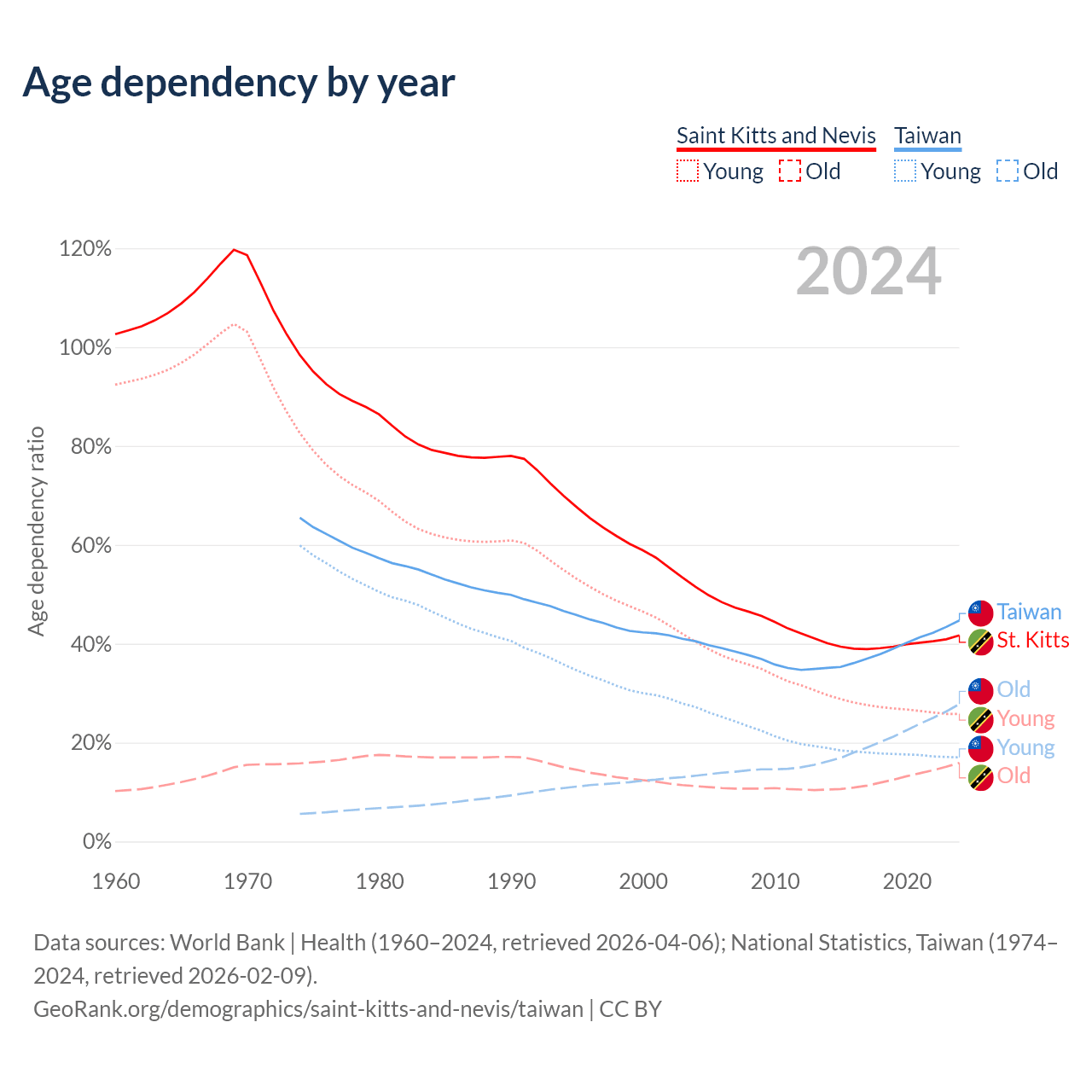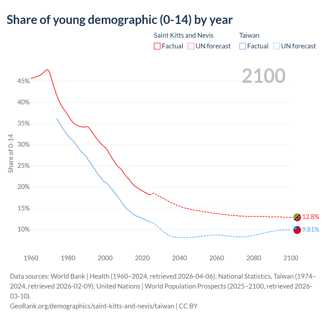 - The share of young demographic (0-15 years old) in Saint Kitts and Nevis is 18.2% vs 11.7% in Taiwan.