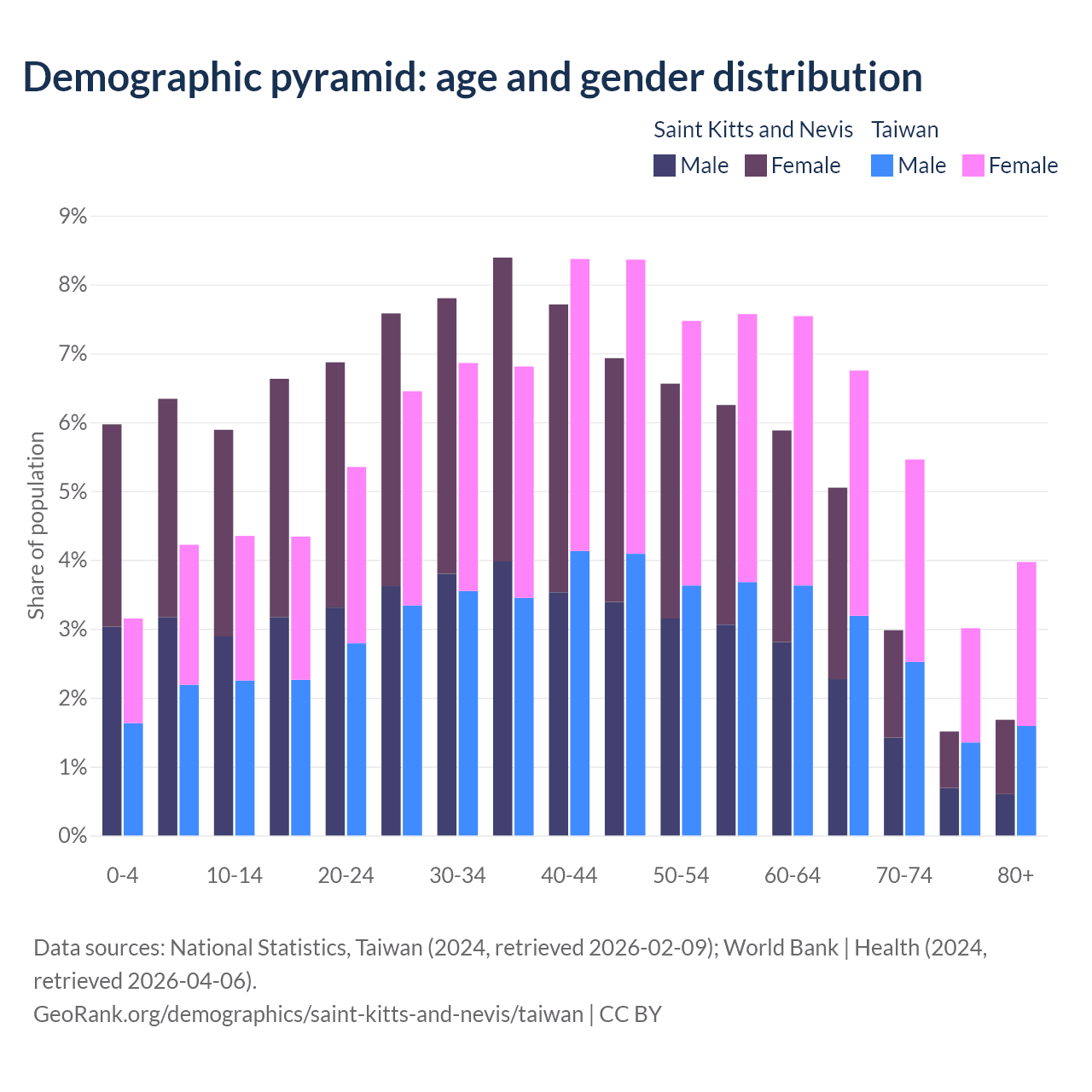 - Saint Kitts and Nevis is ranked 69/196 by median age (oldest to youngest) vs 16/196 for Taiwan.