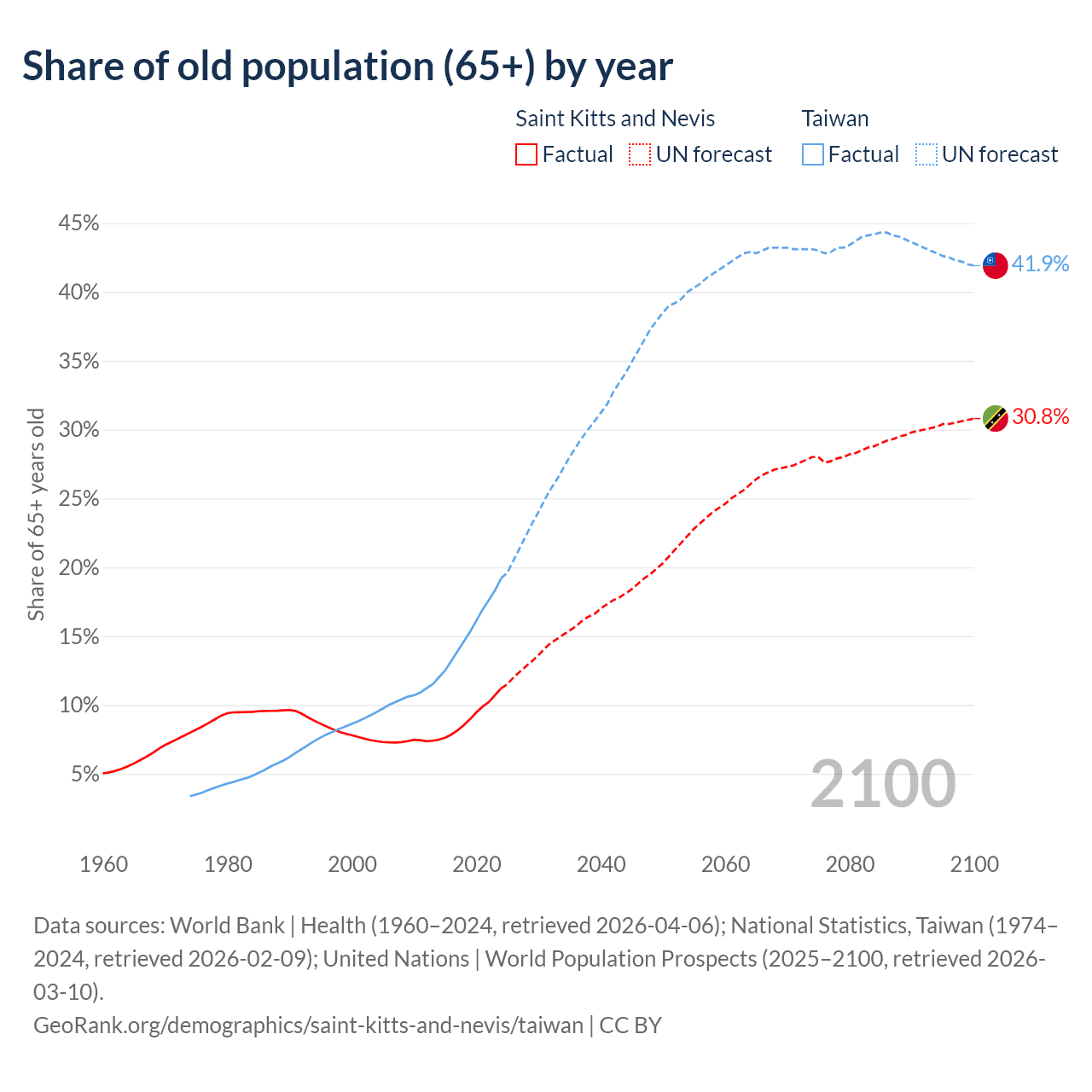 The share of older people aged 65 and over is 11.2% in Saint Kitts and Nevis and 19.2% in Taiwan. Life expectancy in Saint Kitts and Nevis compared to Taiwan .