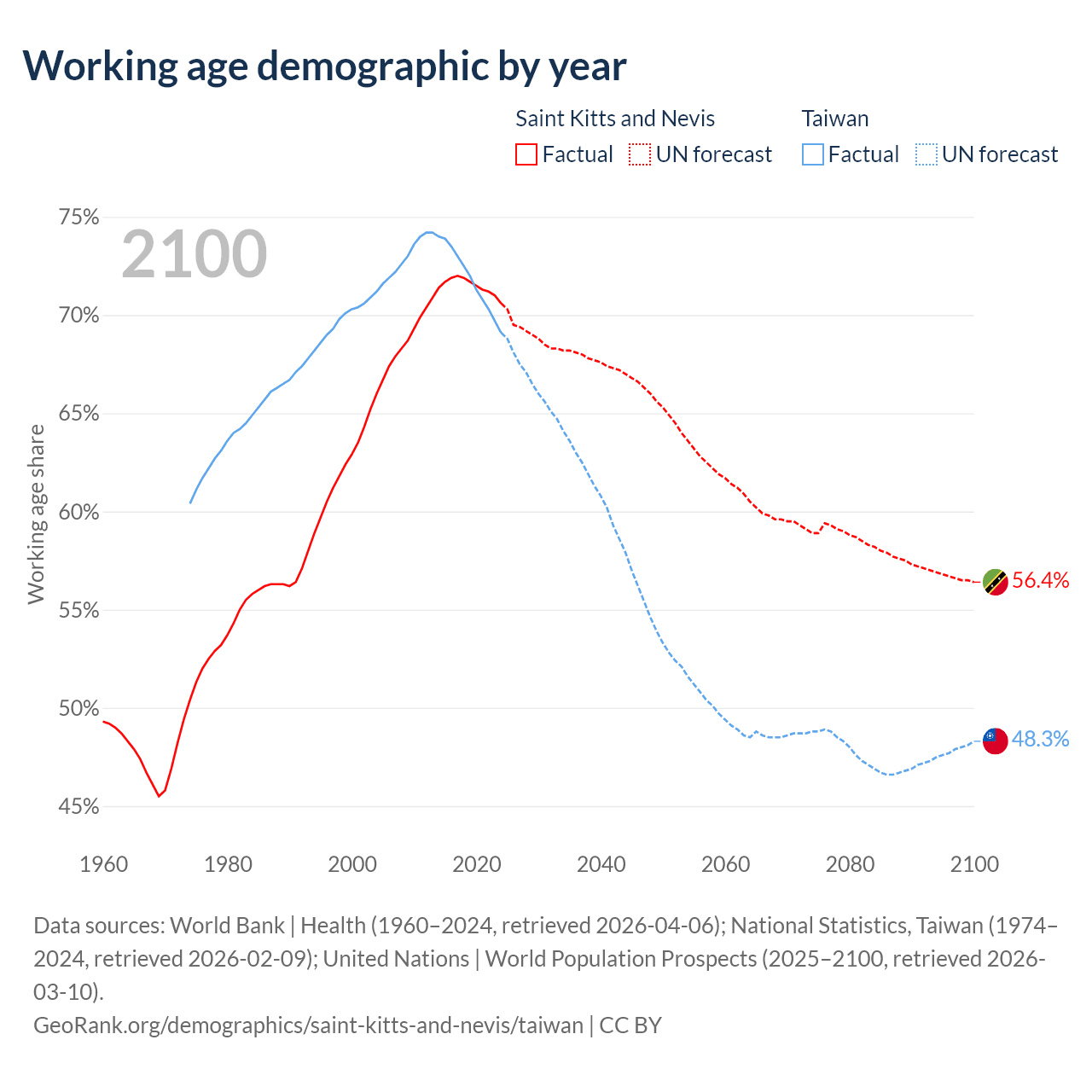 - Saint Kitts and Nevis has 33.2K working age adults (aged 15-64) vs 16.1M in Taiwan.