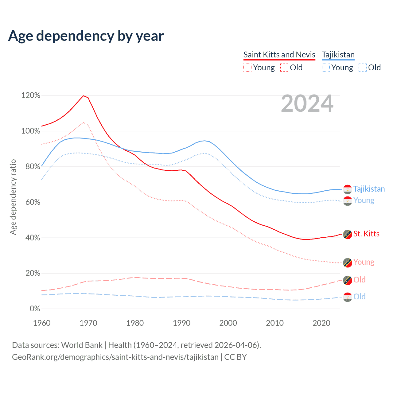 - Saint Kitts and Nevis is ranked 69/196 by median age (oldest to youngest) vs 142/196 for Tajikistan.