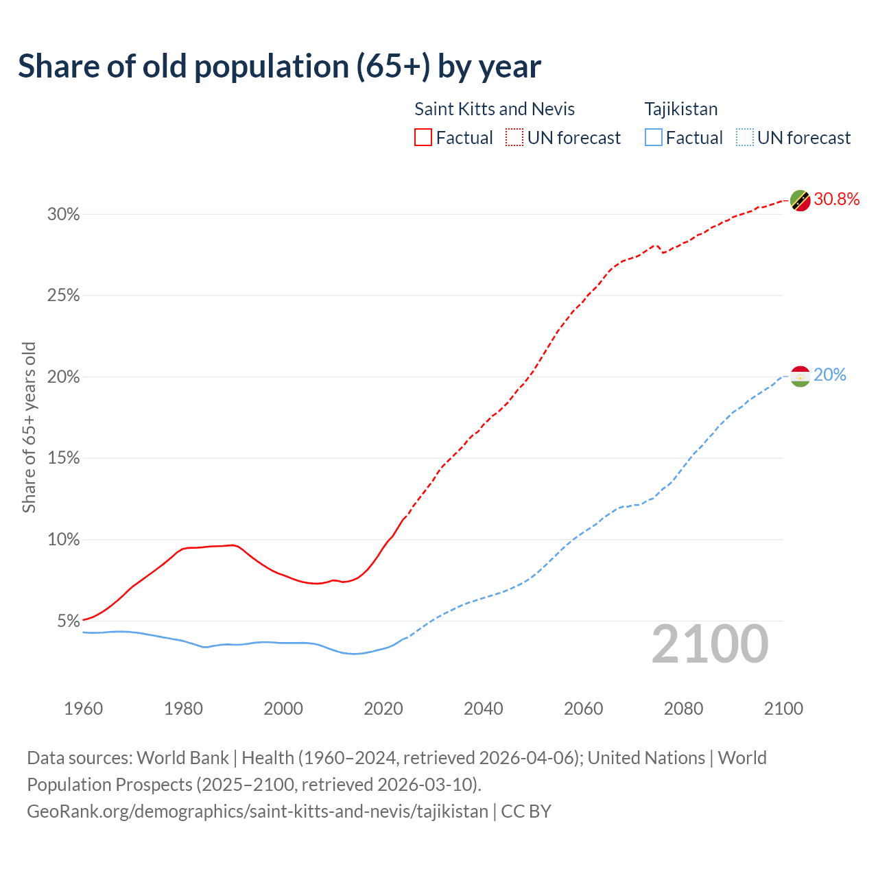 - The share of old-age demographic (65+) in Saint Kitts and Nevis is 11.2% vs 3.85% in Tajikistan.