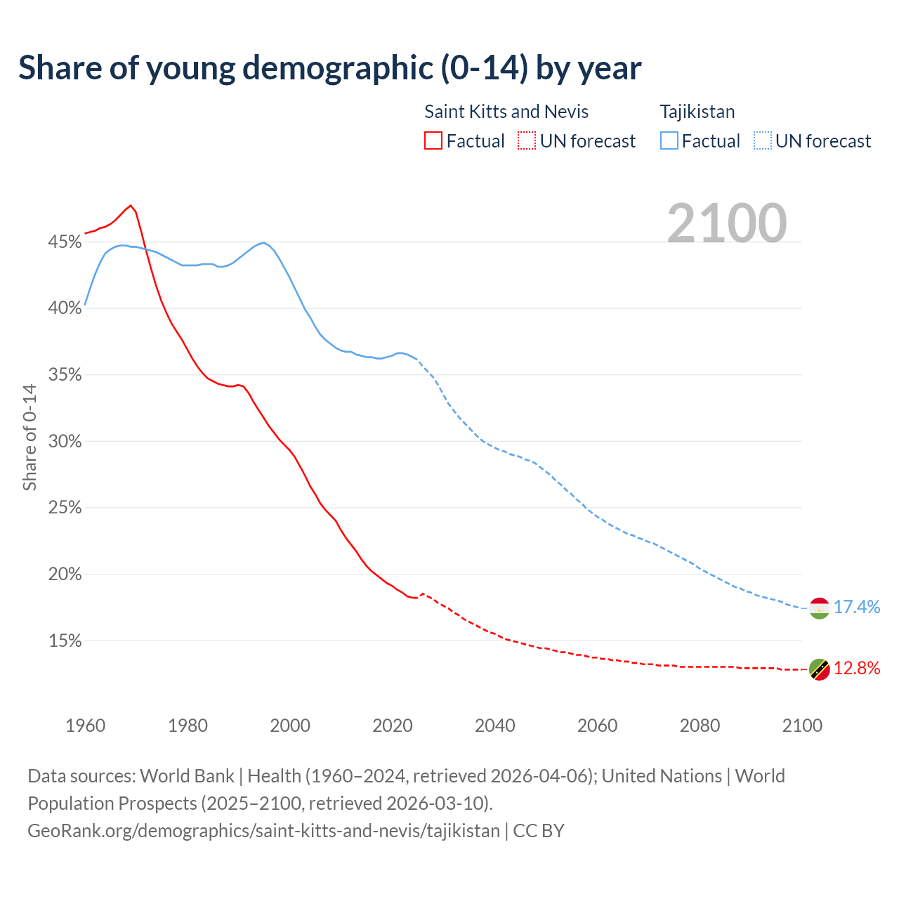 - The share of young demographic (0-15 years old) in Saint Kitts and Nevis is 18.2% vs 36.3% in Tajikistan.