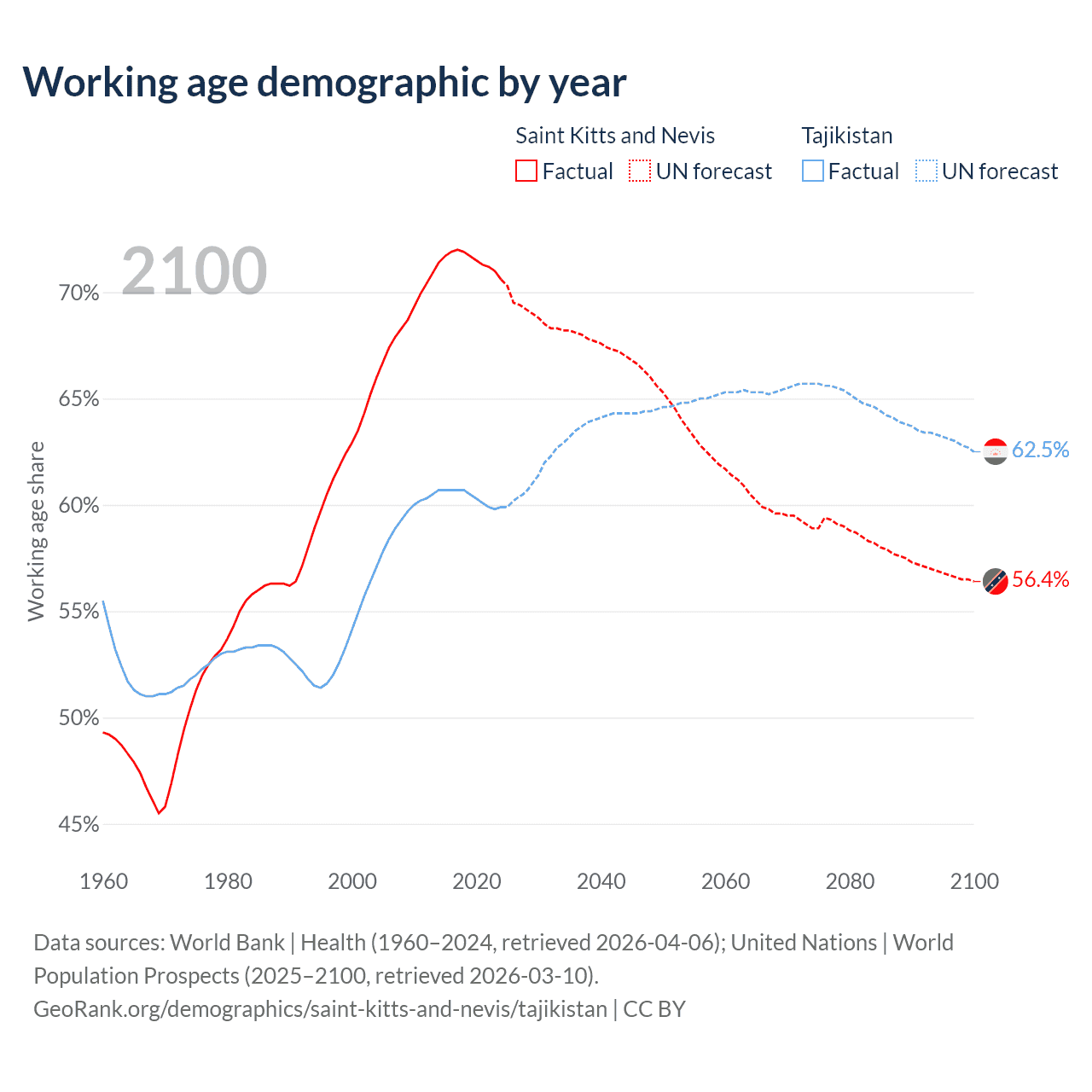 - Saint Kitts and Nevis has 33.2K working age adults (aged 15-64) vs 6.61M in Tajikistan.