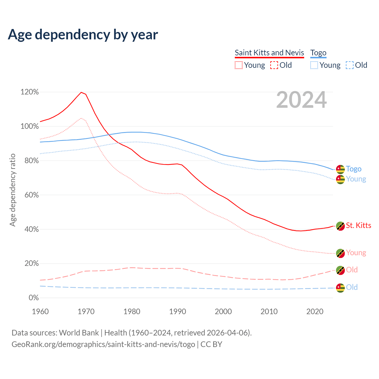 - The share of old-age demographic (65+) in Saint Kitts and Nevis is 11.2% vs 3.21% in Togo.