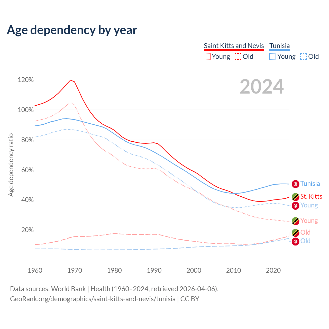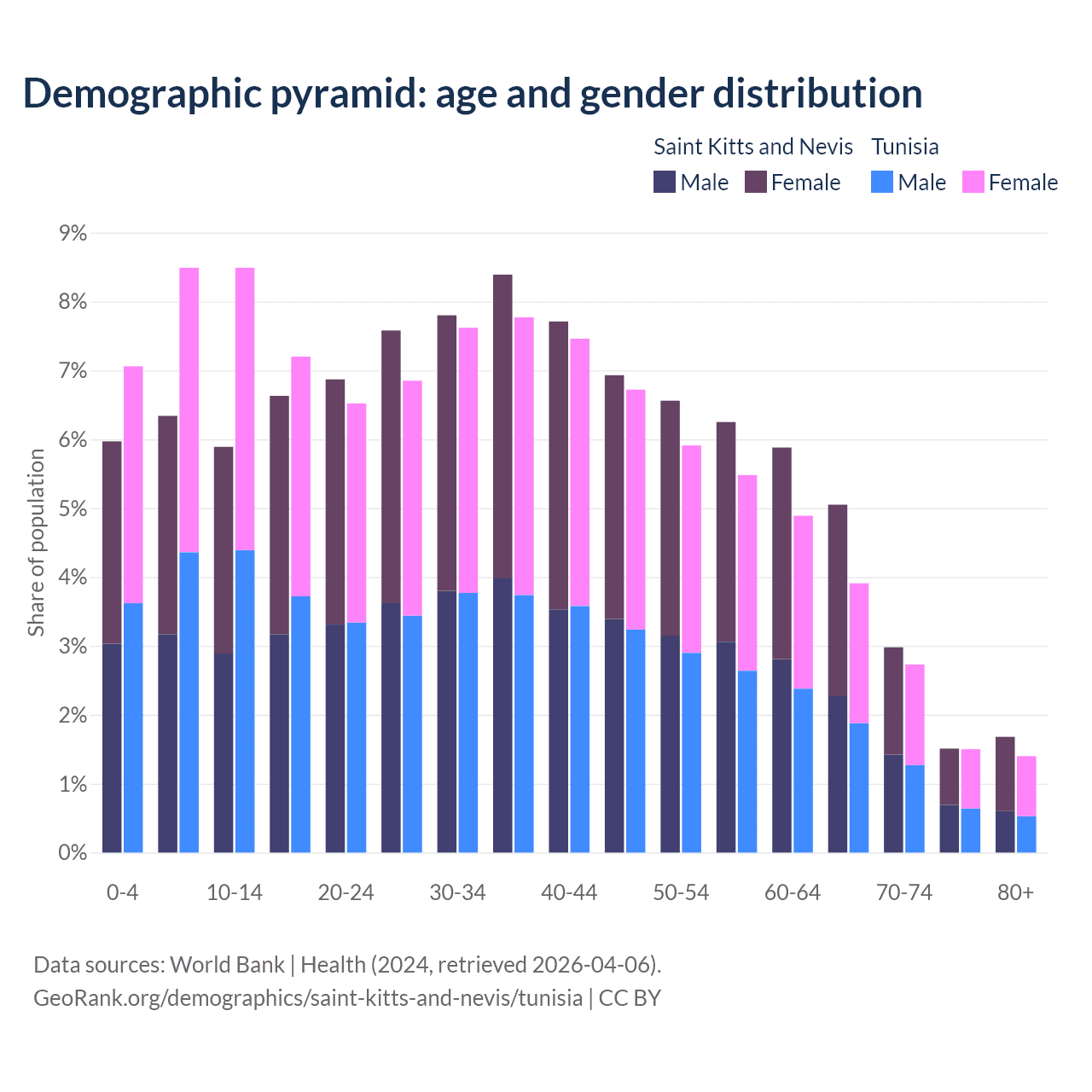 - Saint Kitts and Nevis is ranked 69/196 by median age (oldest to youngest) vs 86/196 for Tunisia.