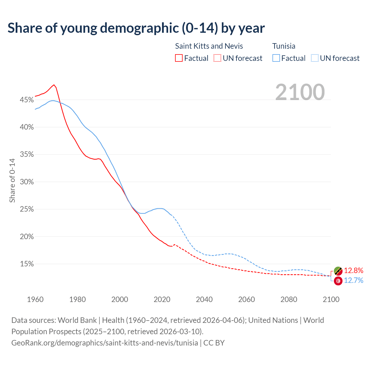 - The share of young demographic (0-15 years old) in Saint Kitts and Nevis is 18.2% vs 24% in Tunisia.