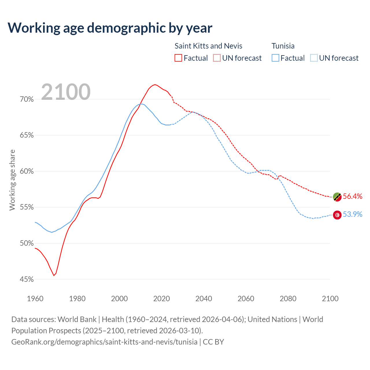 - Saint Kitts and Nevis has 33.2K working age adults (aged 15-64) vs 8.26M in Tunisia.