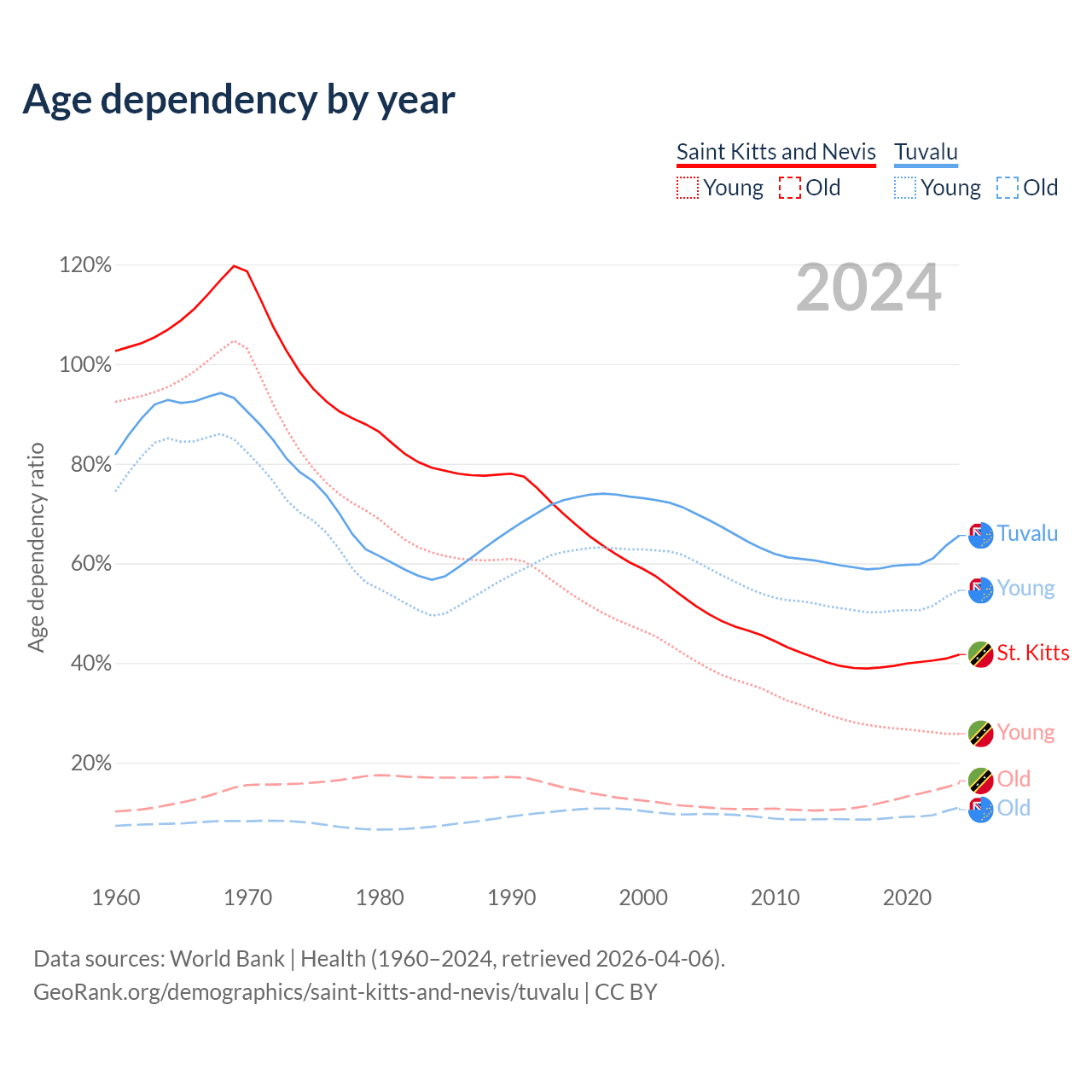 - The share of old-age demographic (65+) in Saint Kitts and Nevis is 11.2% vs 6.67% in Tuvalu.