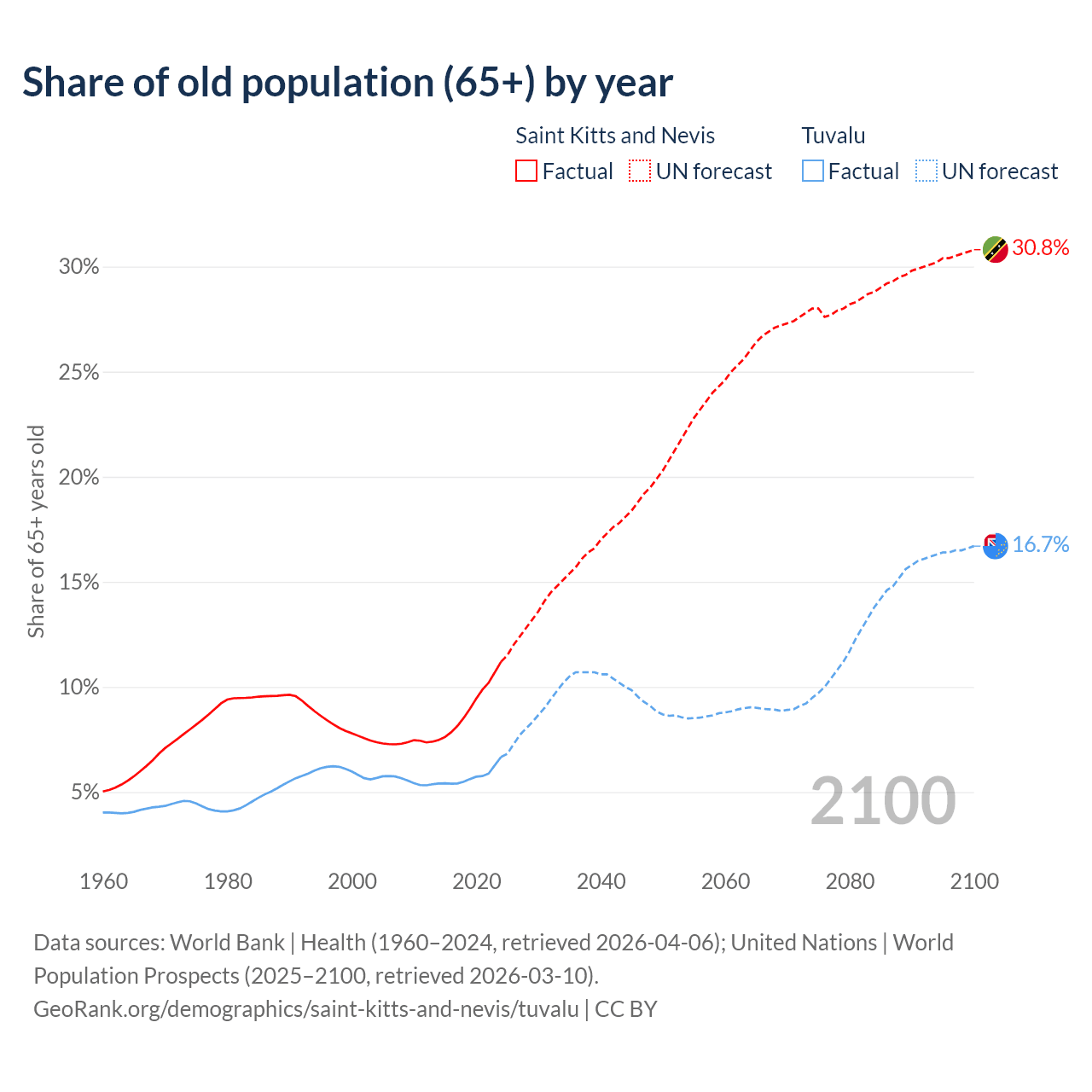 The share of older people aged 65 and over is 11.2% in Saint Kitts and Nevis and 6.67% in Tuvalu. Life expectancy in Saint Kitts and Nevis compared to Tuvalu .