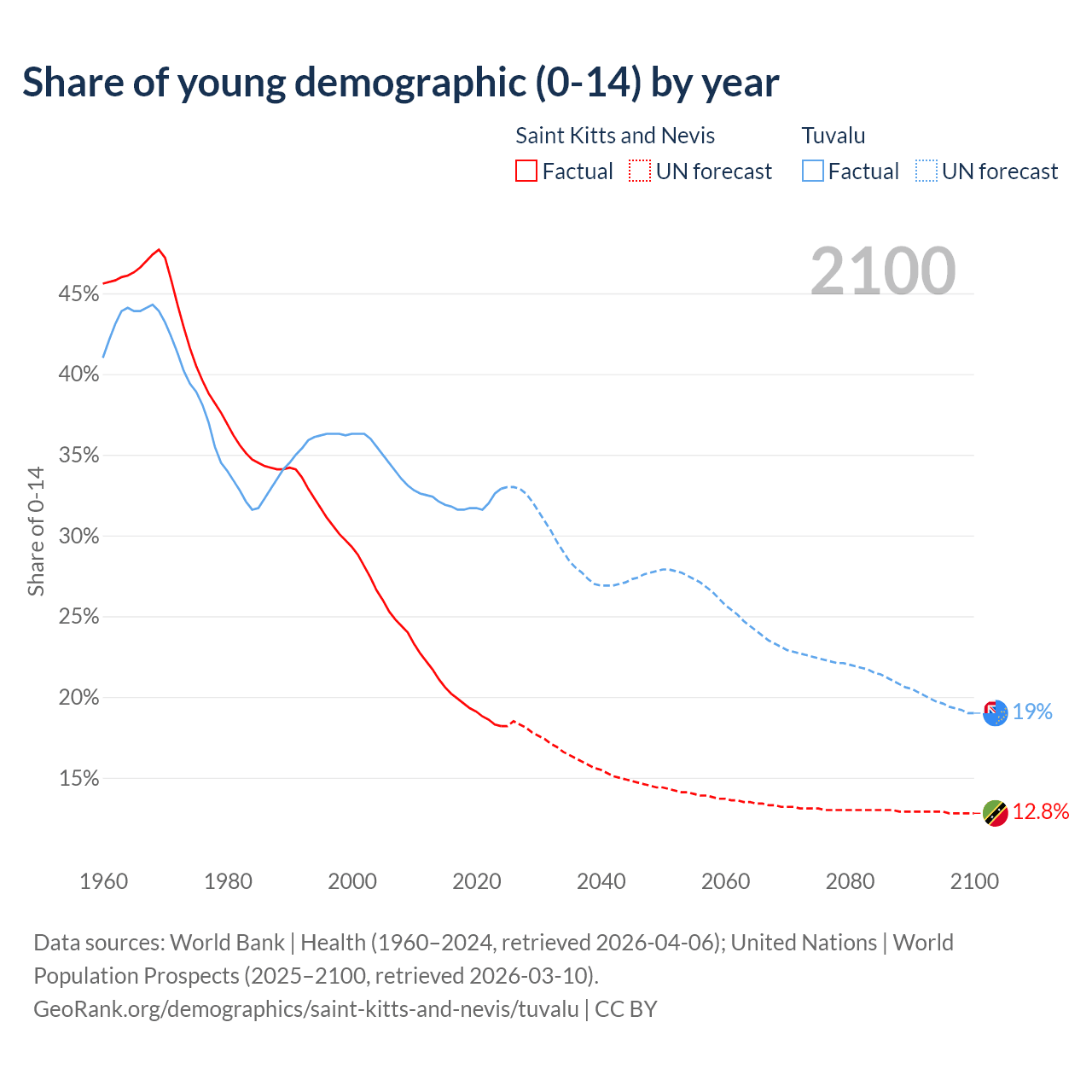 - The share of young demographic (0-15 years old) in Saint Kitts and Nevis is 18.2% vs 32.9% in Tuvalu.
