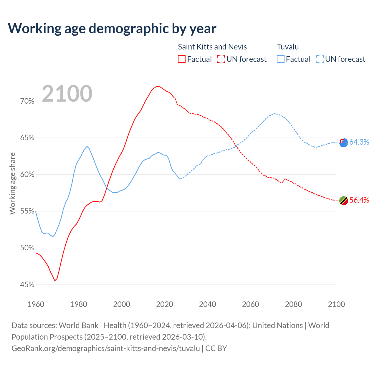 - Saint Kitts and Nevis has 33.2K working age adults (aged 15-64) vs 5.64K in Tuvalu.