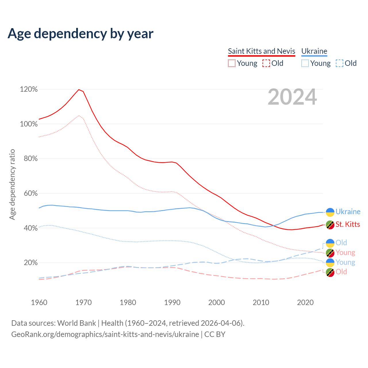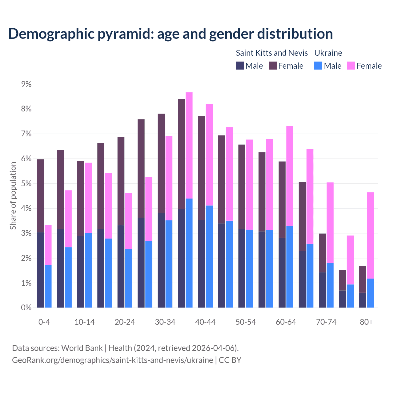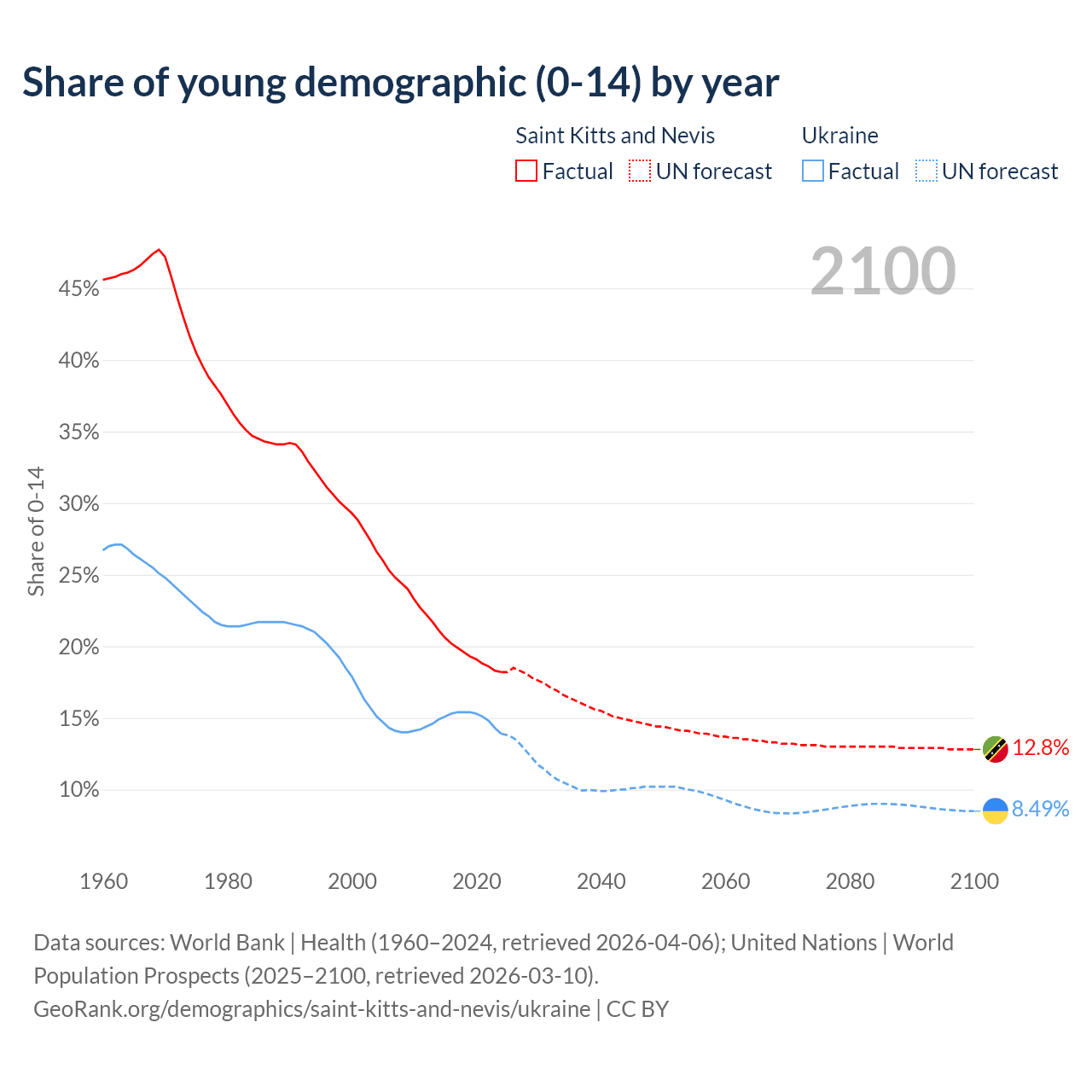 - The share of young demographic (0-15 years old) in Saint Kitts and Nevis is 18.2% vs 13.9% in Ukraine.