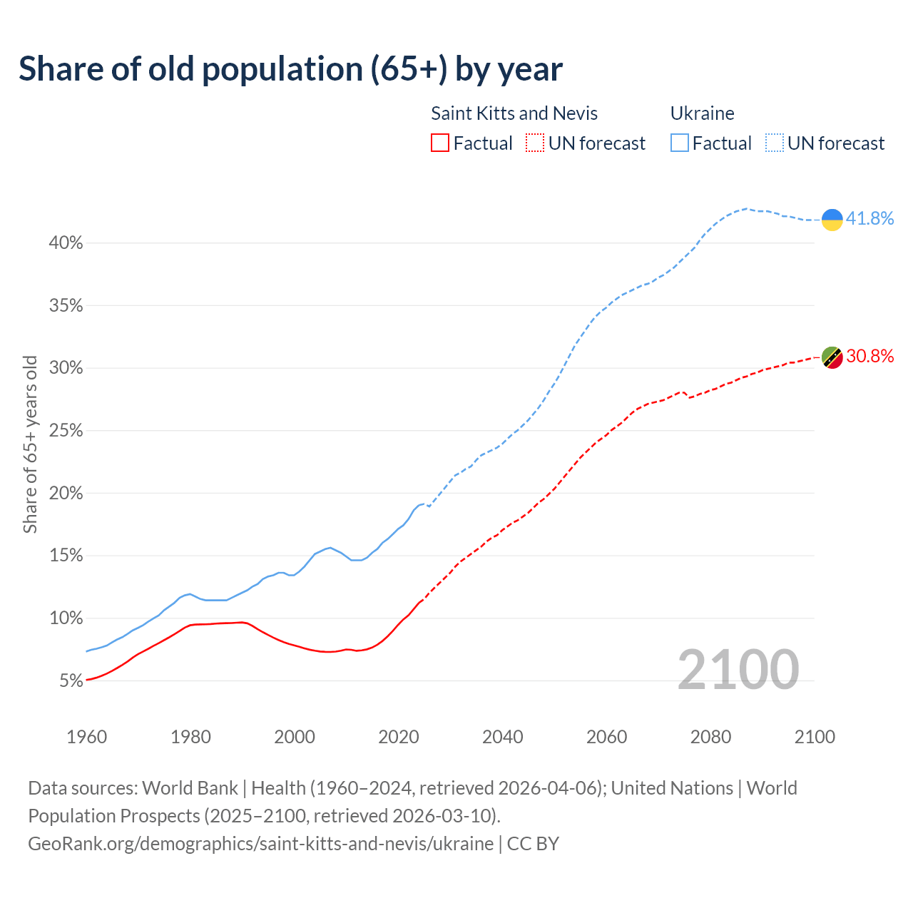 - The share of old-age demographic (65+) in Saint Kitts and Nevis is 11.2% vs 19% in Ukraine.