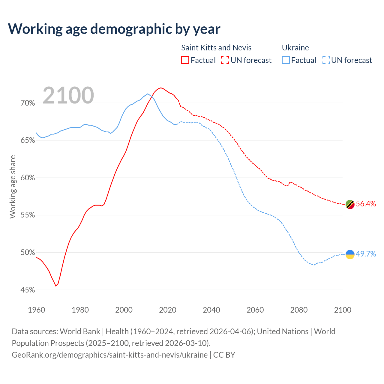 - Saint Kitts and Nevis has 33.2K working age adults (aged 15-64) vs 26.9M in Ukraine.