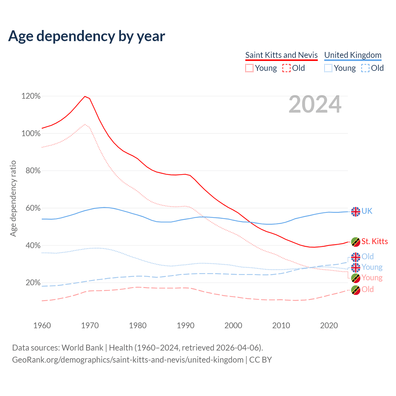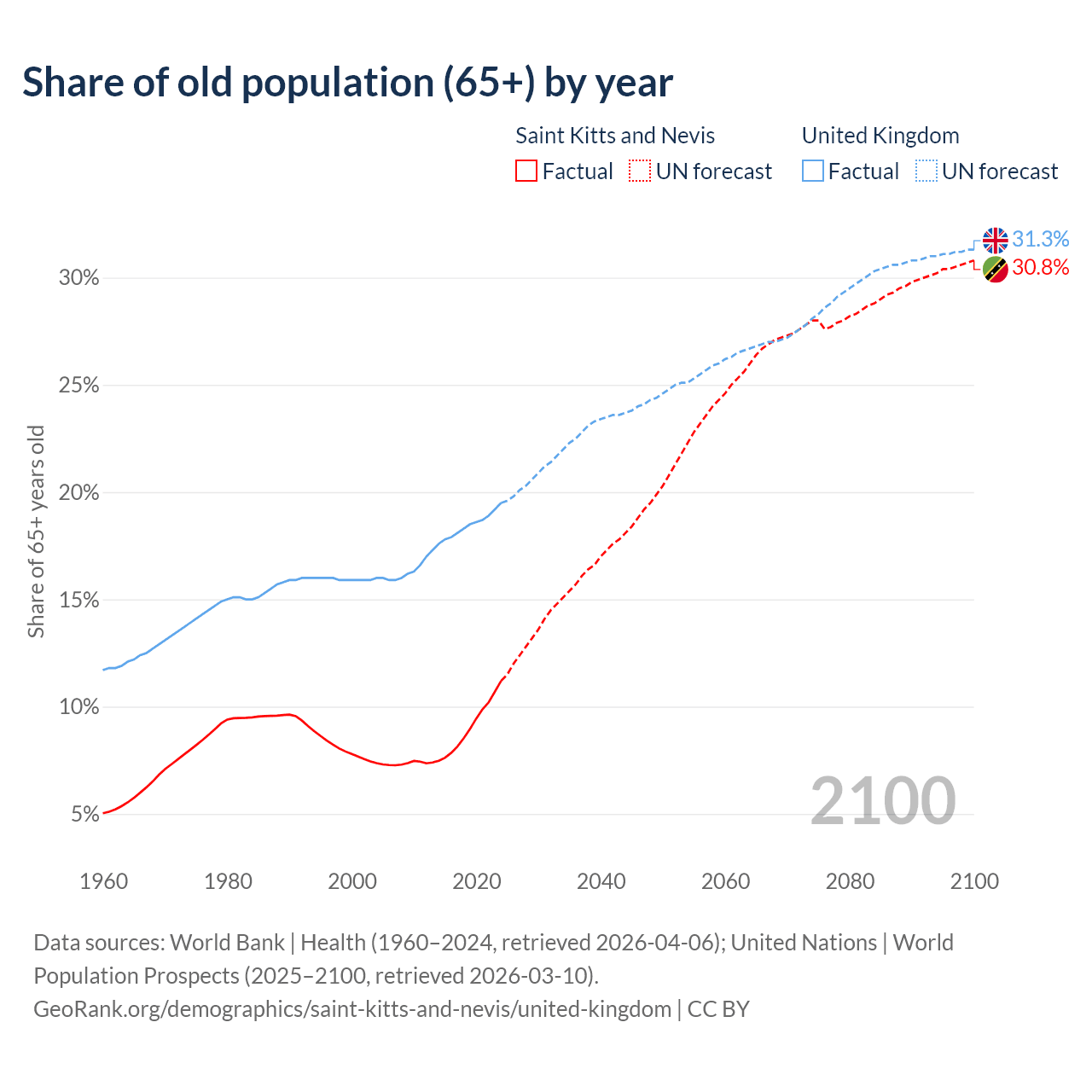 The share of older people aged 65 and over is 11.2% in Saint Kitts and Nevis and 19.5% in the United Kingdom. Life expectancy in Saint Kitts and Nevis compared to the United Kingdom .