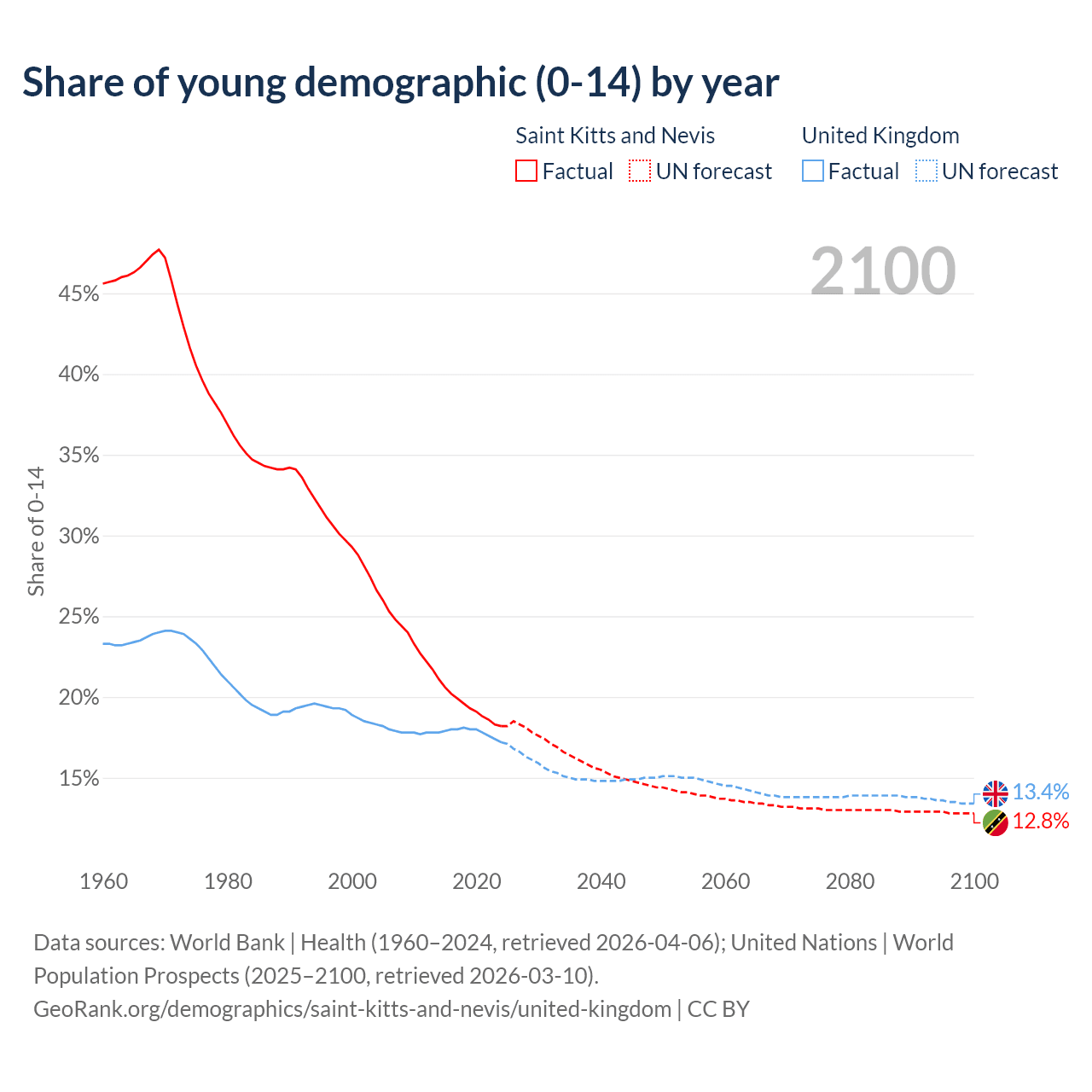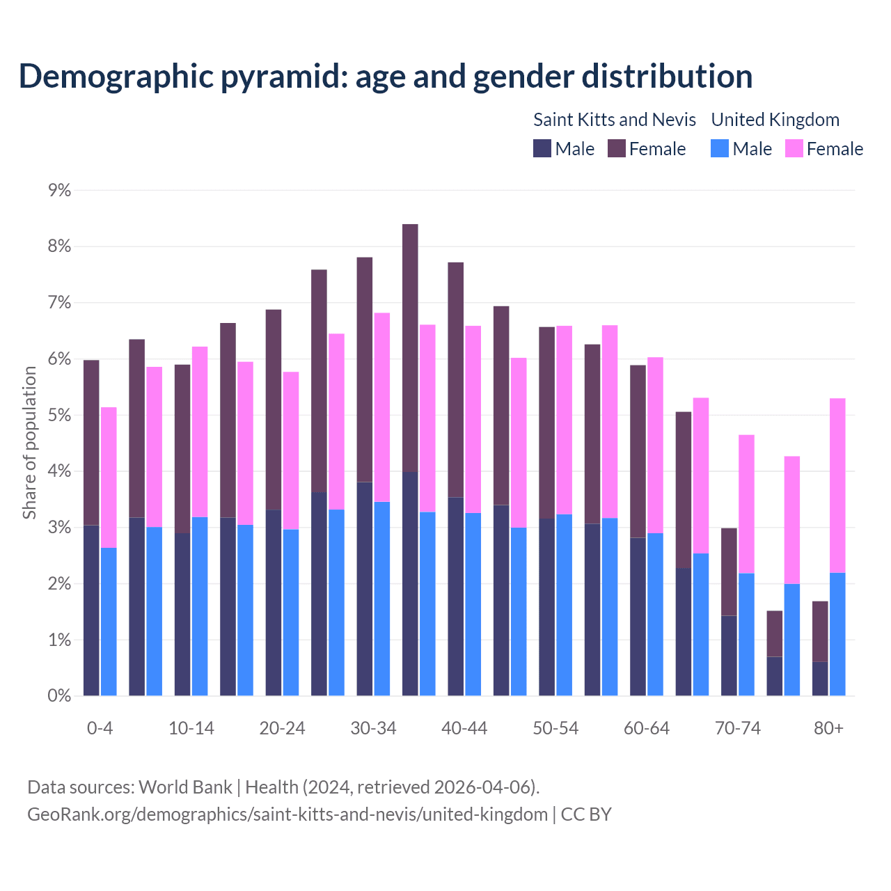 - The share of young demographic (0-15 years old) in Saint Kitts and Nevis is 18.2% vs 17.2% in the United Kingdom.