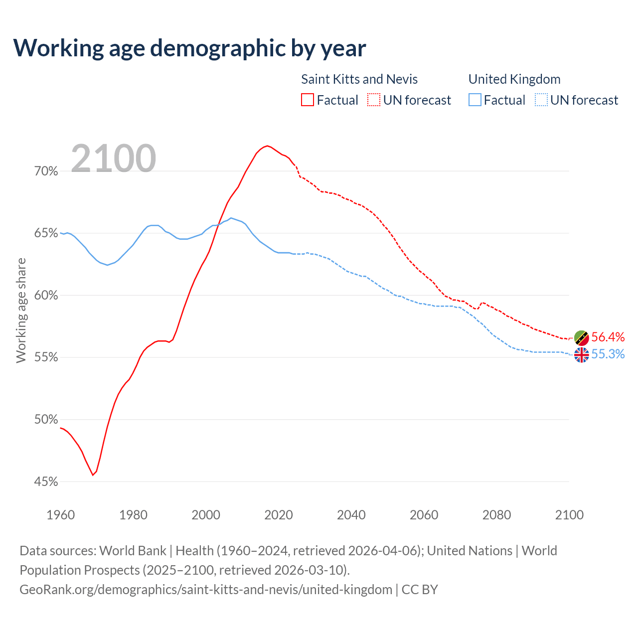 - Saint Kitts and Nevis has 33.2K working age adults (aged 15-64) vs 44.4M in the United Kingdom.