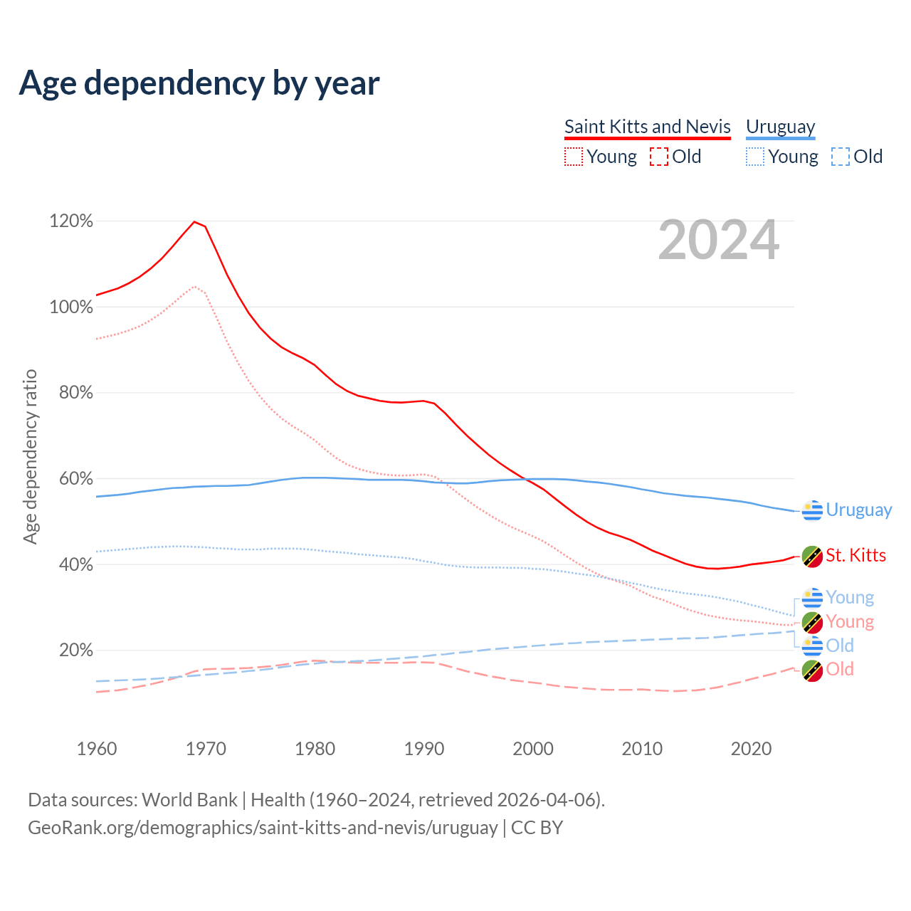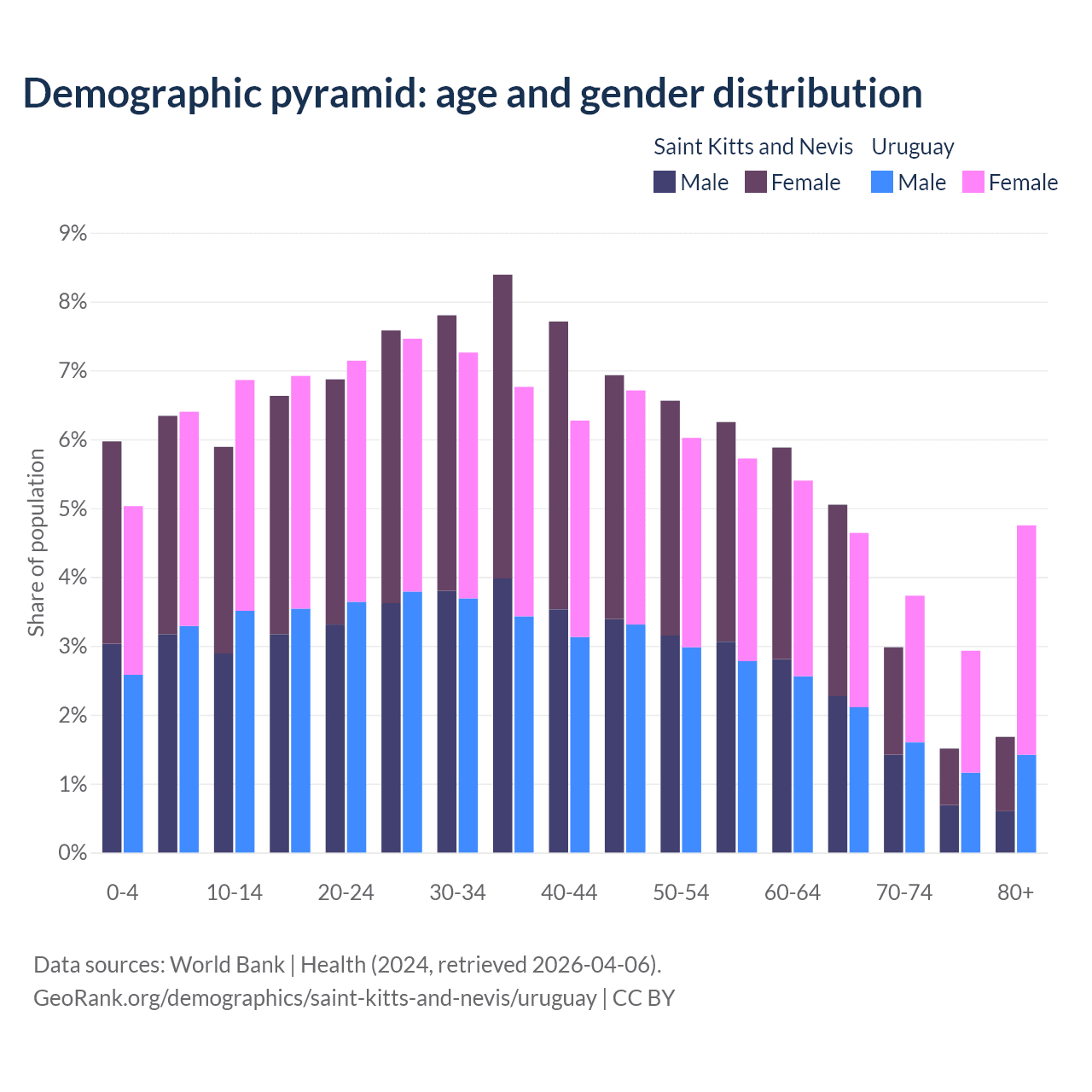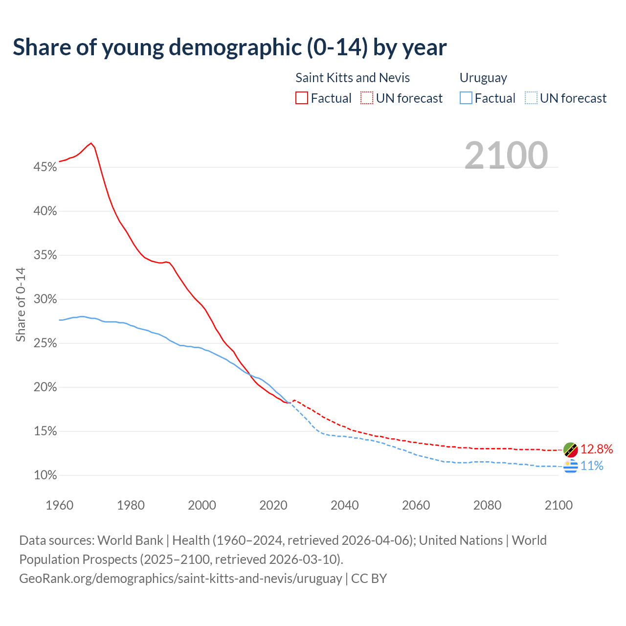 - The share of young demographic (0-15 years old) in Saint Kitts and Nevis is 18.2% vs 18.3% in Uruguay.