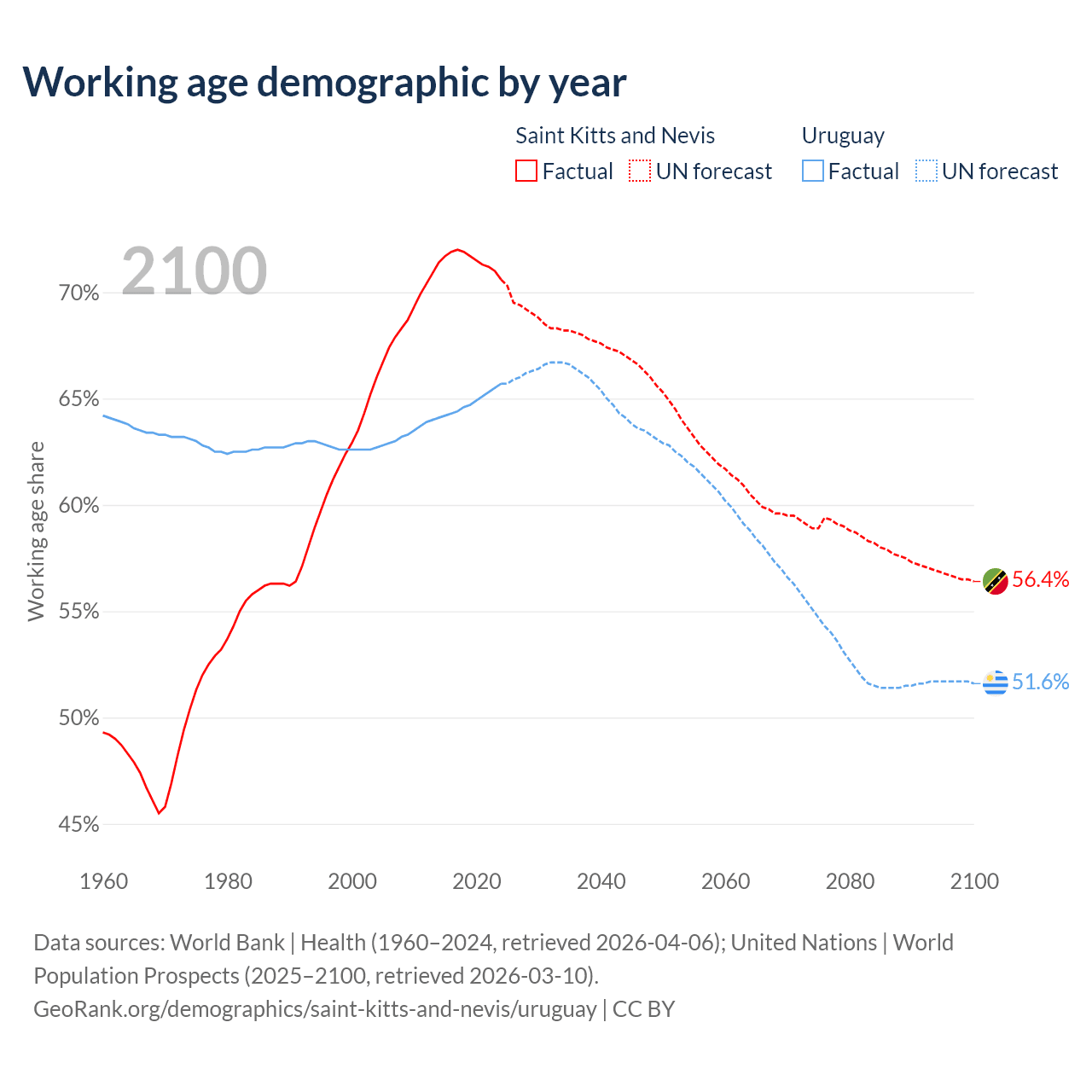 - Saint Kitts and Nevis has 33.2K working age adults (aged 15-64) vs 2.22M in Uruguay.