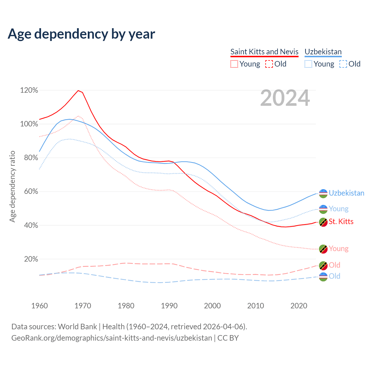- The share of old-age demographic (65+) in Saint Kitts and Nevis is 11.2% vs 5.86% in Uzbekistan.