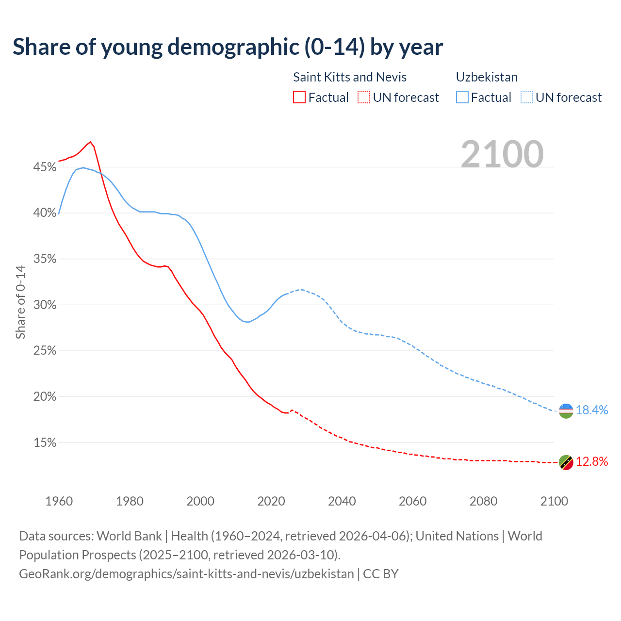 - The share of young demographic (0-15 years old) in Saint Kitts and Nevis is 18.2% vs 31.1% in Uzbekistan.
