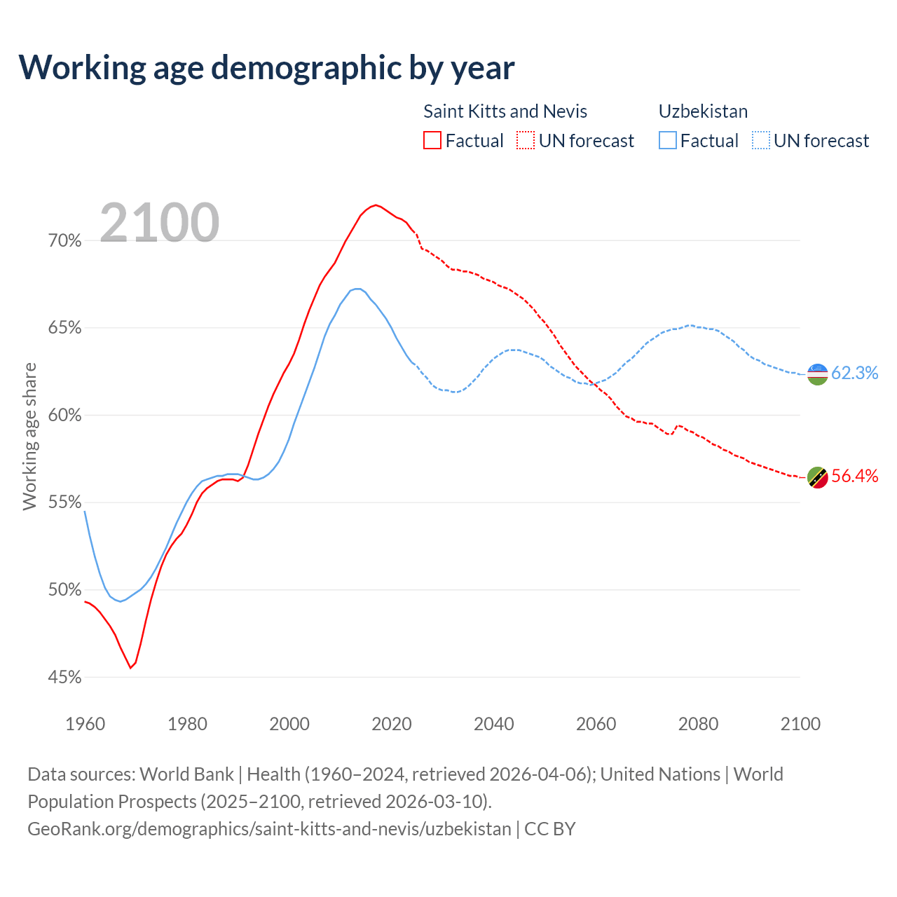 - Saint Kitts and Nevis has 33.2K working age adults (aged 15-64) vs 23.9M in Uzbekistan.